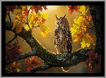 Ptak, Sowa uszata, Drzewo, Dąb, Gałązka, Kolorowe, Liście, Jesień Sowa Uszata