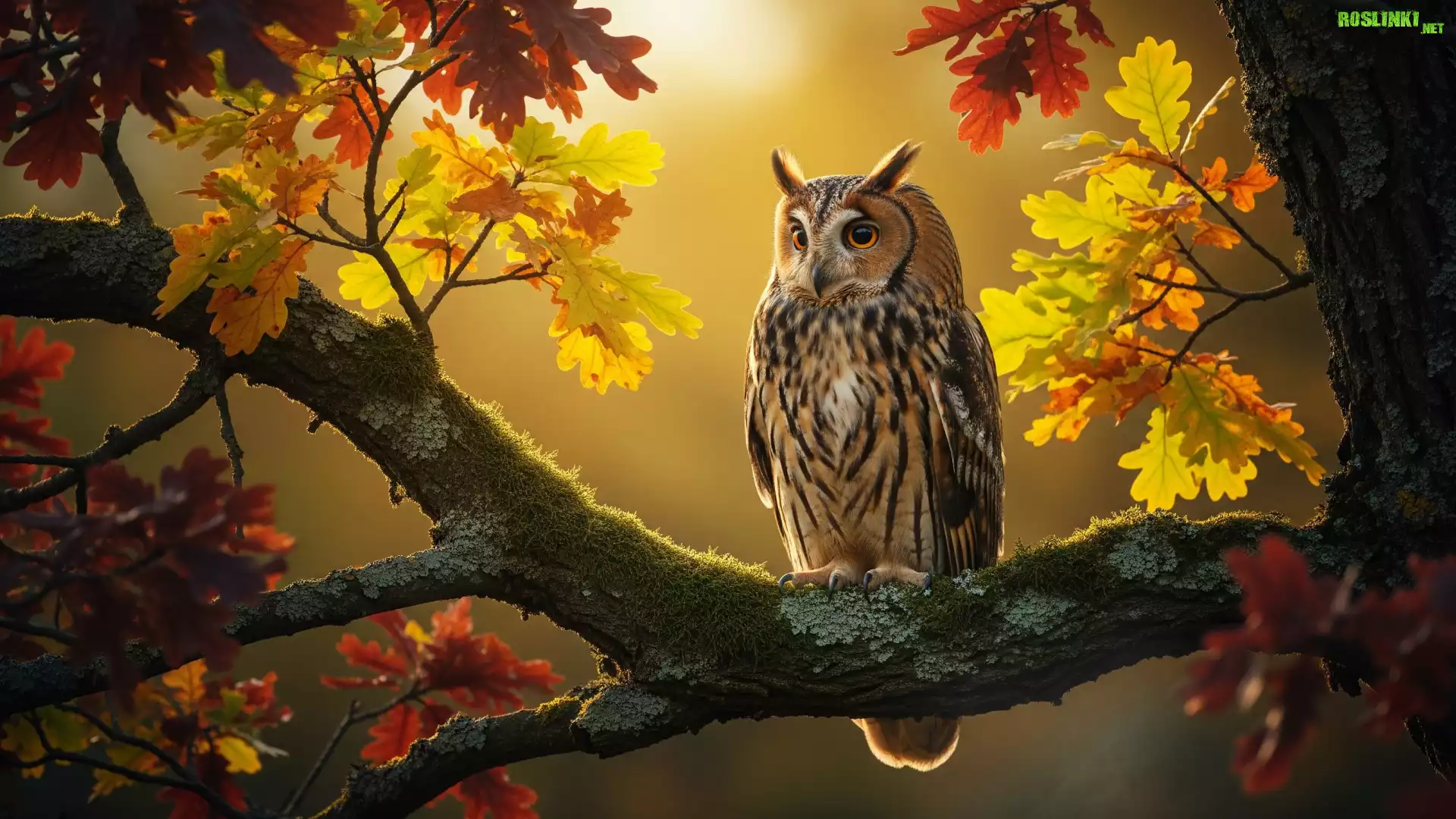 Rośliny: Ptak, Sowa uszata, Drzewo, Dąb, Gałązka, Kolorowe, Liście, Jesień Sowa Uszata