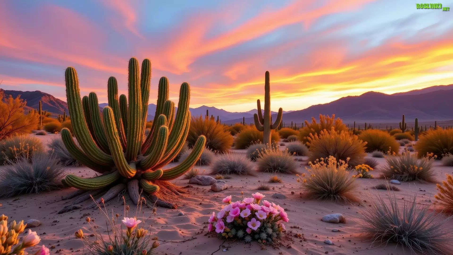 Rośliny: Kolorowe, Niebo, Kaktusy, Różowe, Kwiaty, Kępki, Rośliny, Piasek, Góry