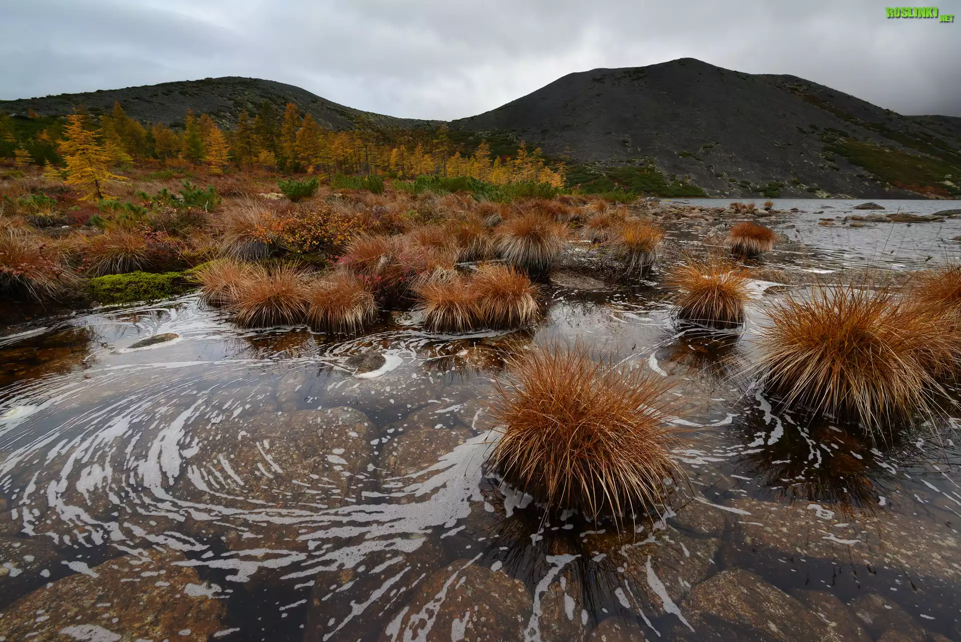 Rośliny: Jesień, Góry Kołymskie, Jezioro Anemone, Kępy, Trawy, Kołyma, Obwód magadański, Rosja