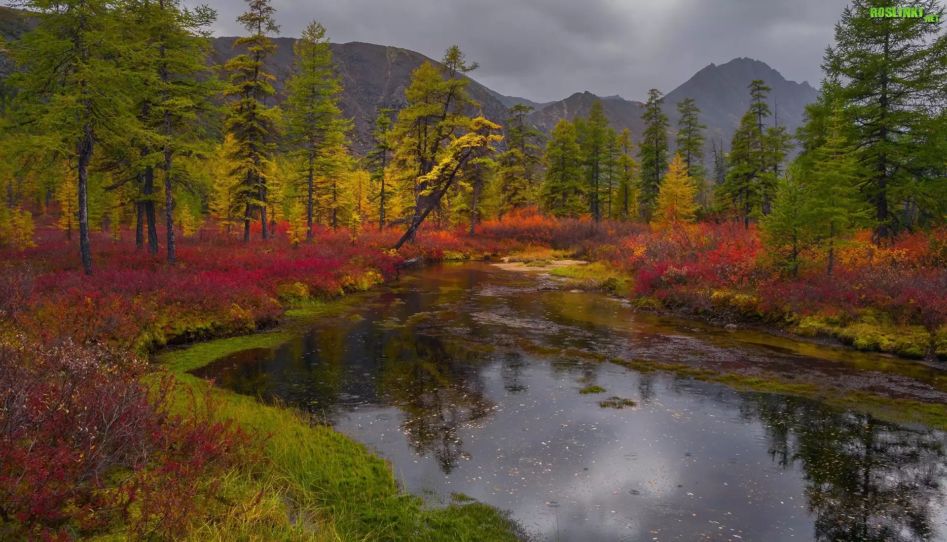 Rośliny: Jesień, Jezioro Jack London, Góry Kołymskie, Drzewa, Rośliny, Kołyma, Obwód magadański, Rosja
