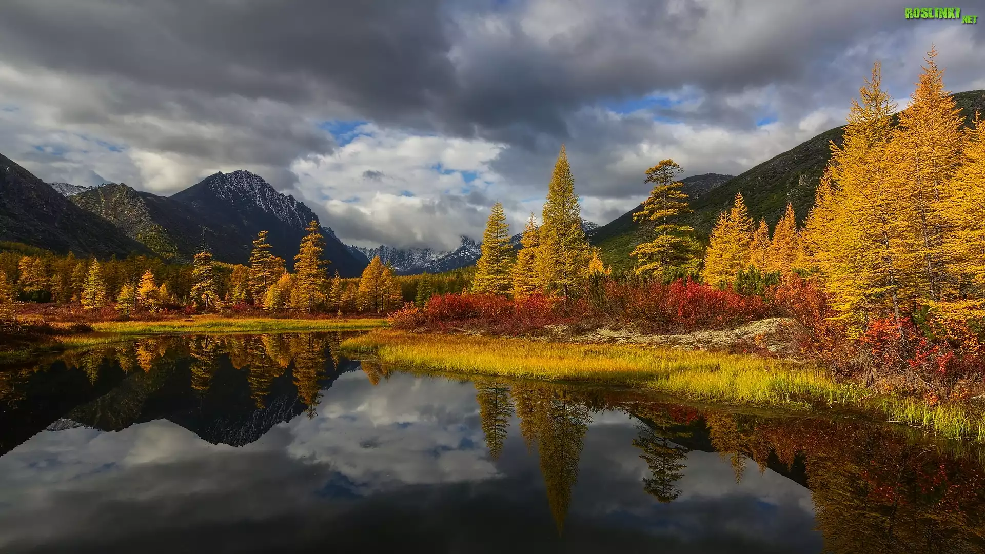 Rośliny: Jesień, Góry Kołymskie, Jezioro Nevidimka, Chmury, Drzewa, Roślinność, Kołyma, Magadan, Rosja