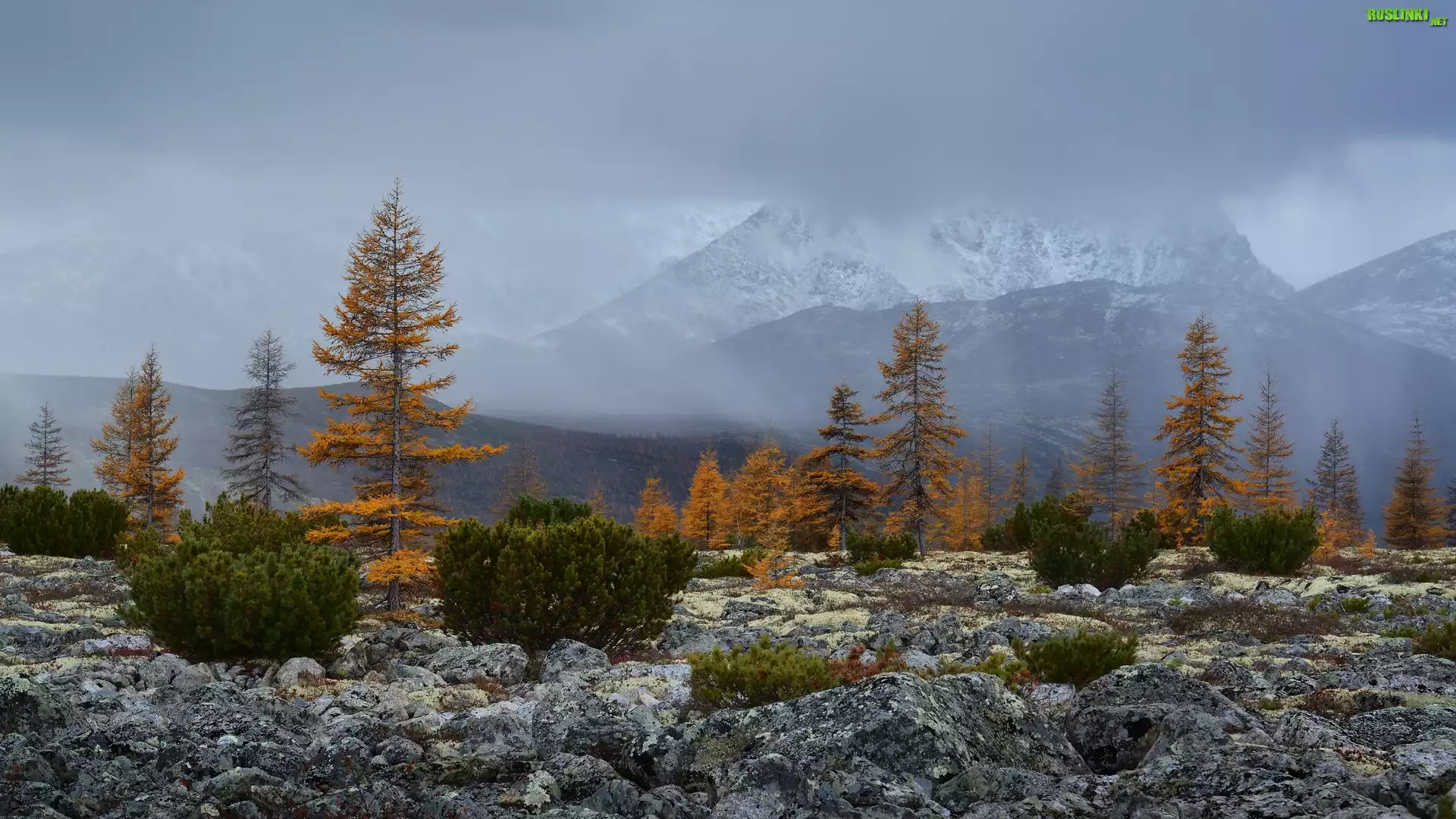 Rośliny: Jesień, Góry Kołymskie, Mgła, Rośliny, Drzewa, Skały, Kołyma, Obwód magadański, Rosja