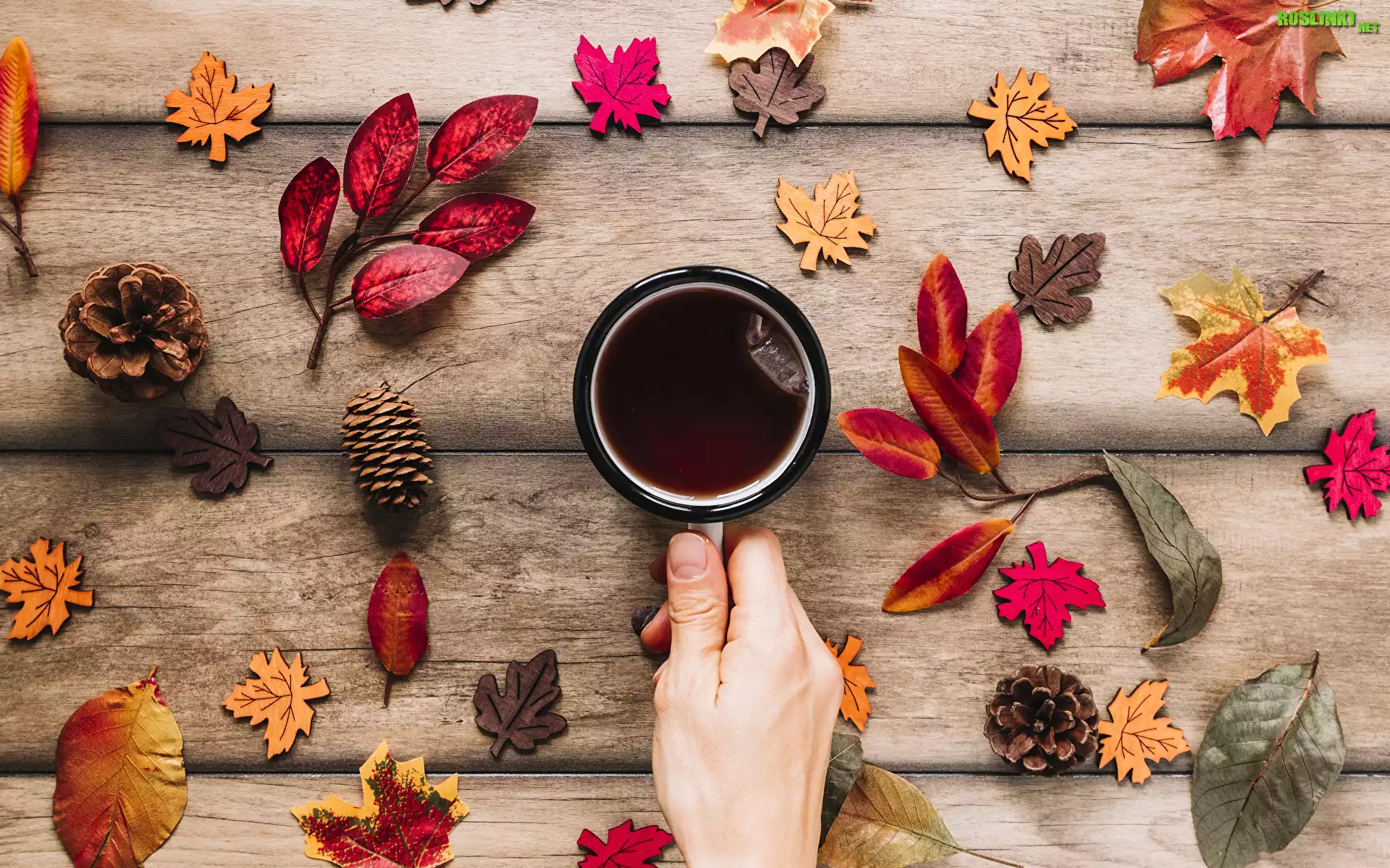 Rośliny: Ręka, Kubek, Herbata, Deski, Kolorowe, Liście, Szyszki, Kompozycja