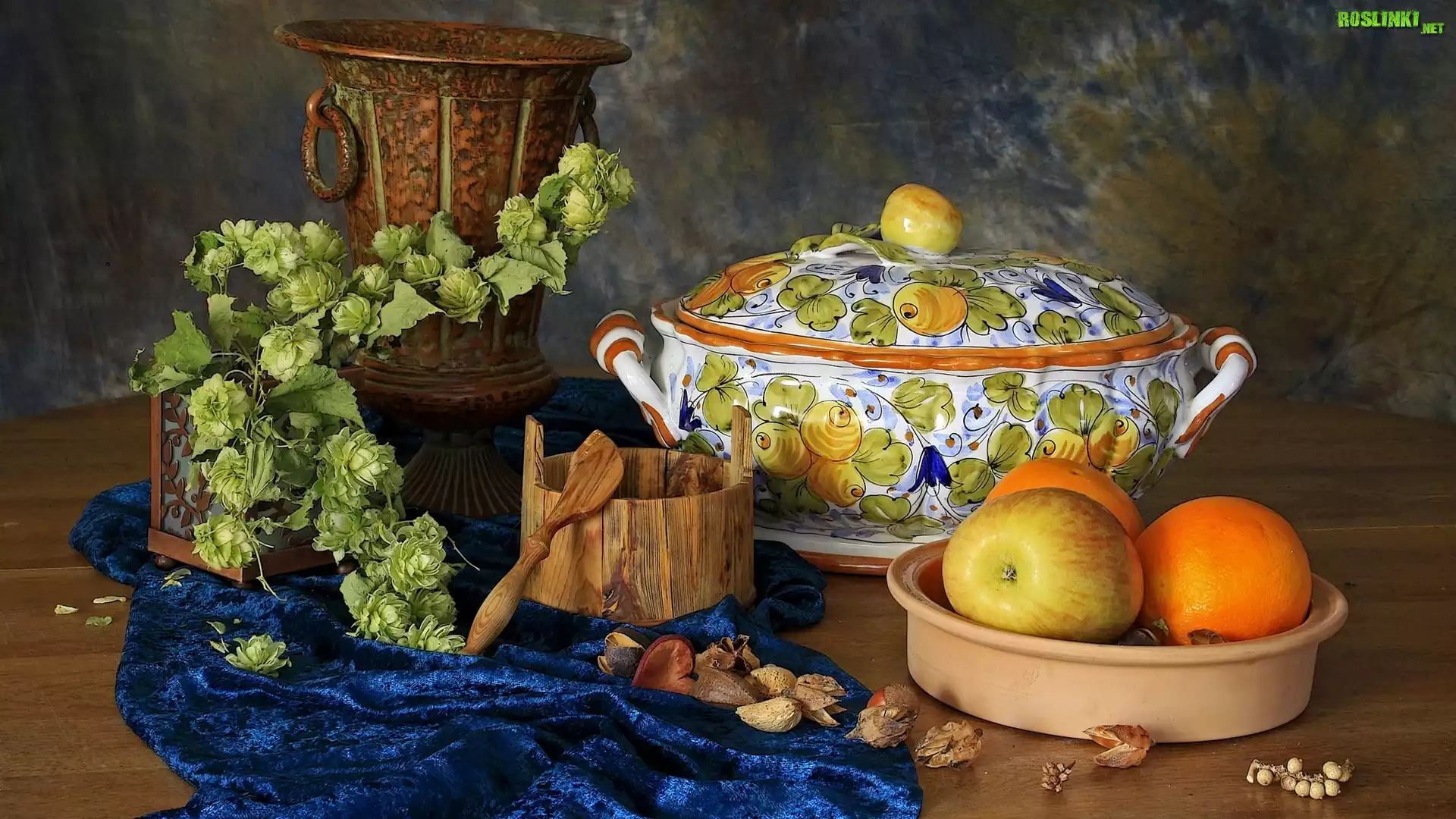 Rośliny: Kompozycja, Waza, Chmiel, Jabłko, Pomarańcze