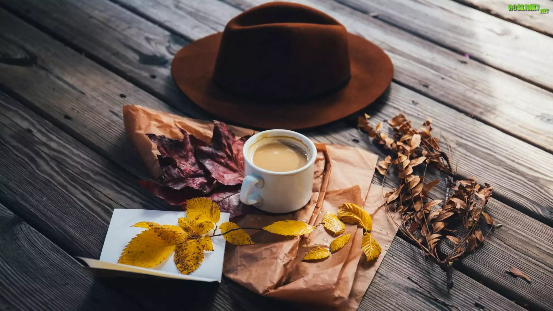 Kompozycja, Kawa, Kapelusz, Liście, Deski