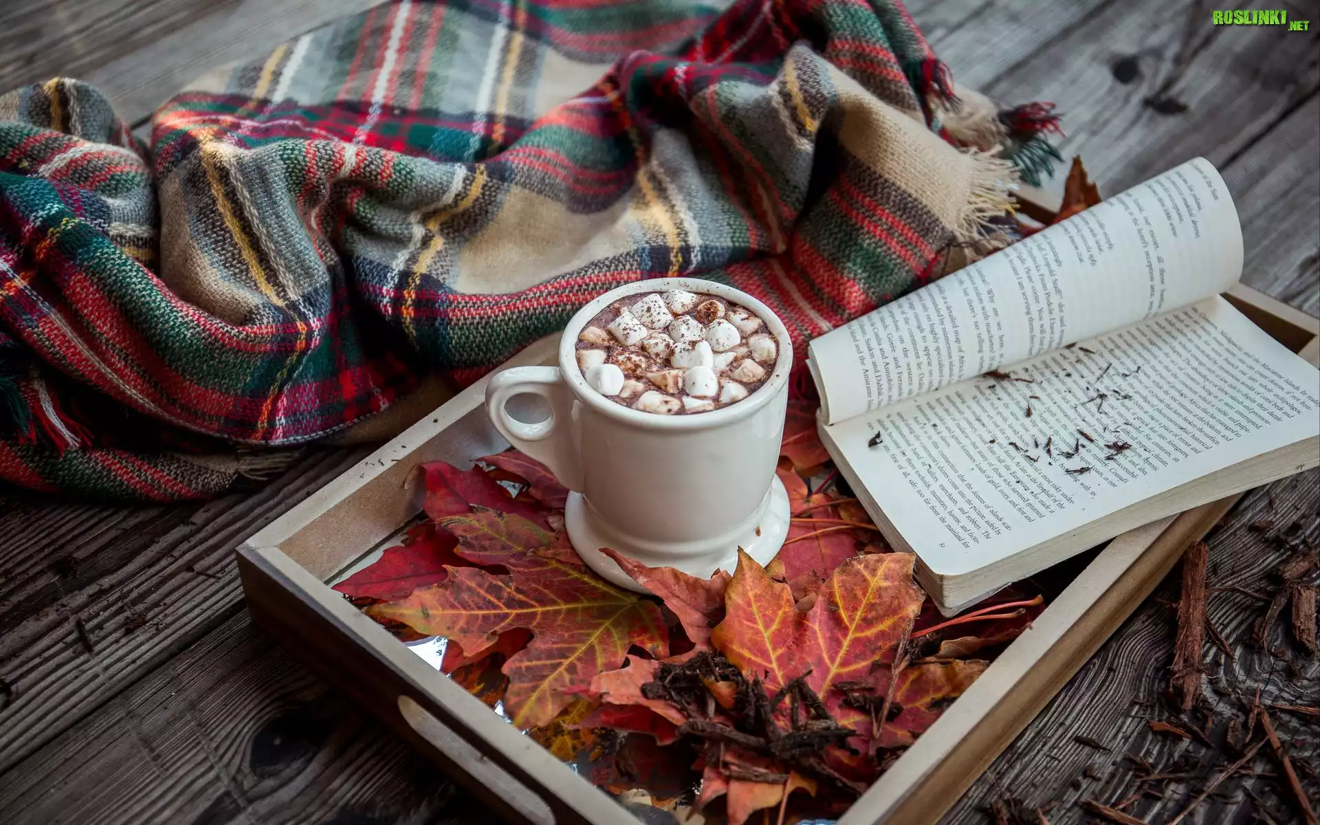 Rośliny: Kompozycja, Taca, Kubek, Kakao, Pianki, Książka, Liście, Kraciasty, Koc