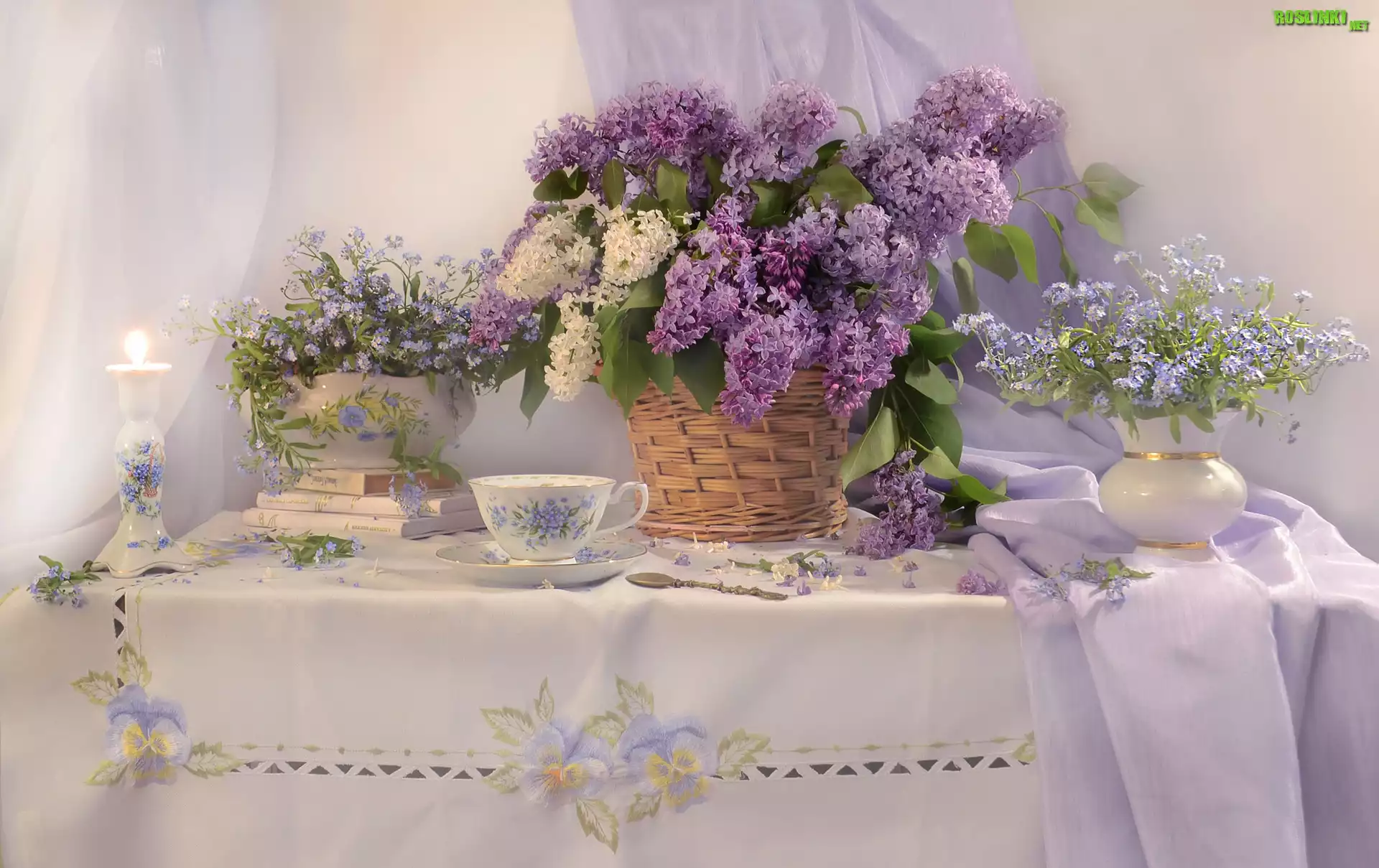 Kwiaty, Bez, Niezapominajki, Bukiet, Wazon, Koszyk, Filiżanka, Świecznik, Kompozycja