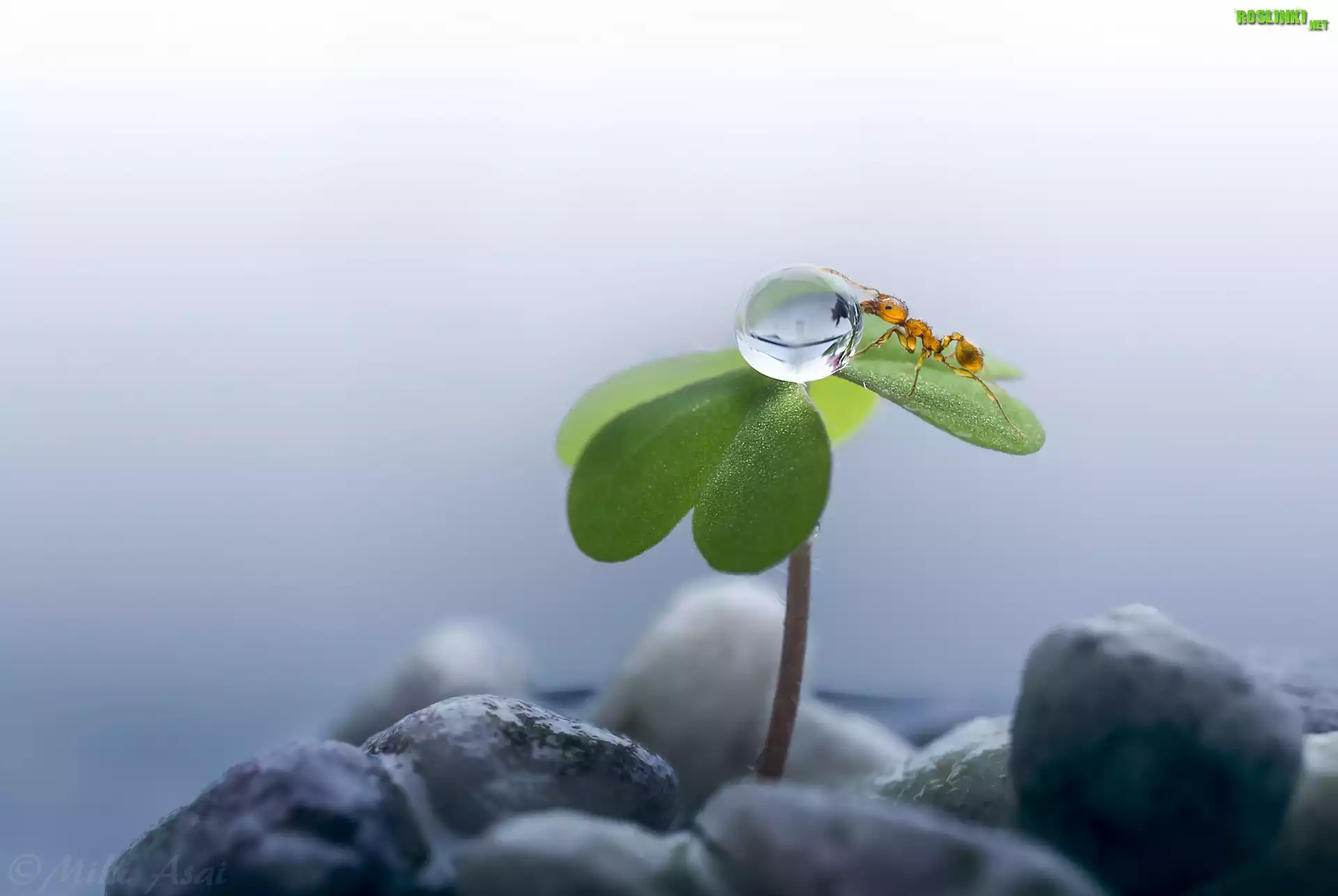 Rośliny: Koniczynka, Kropla, Mrówka, Kamyki, Makro