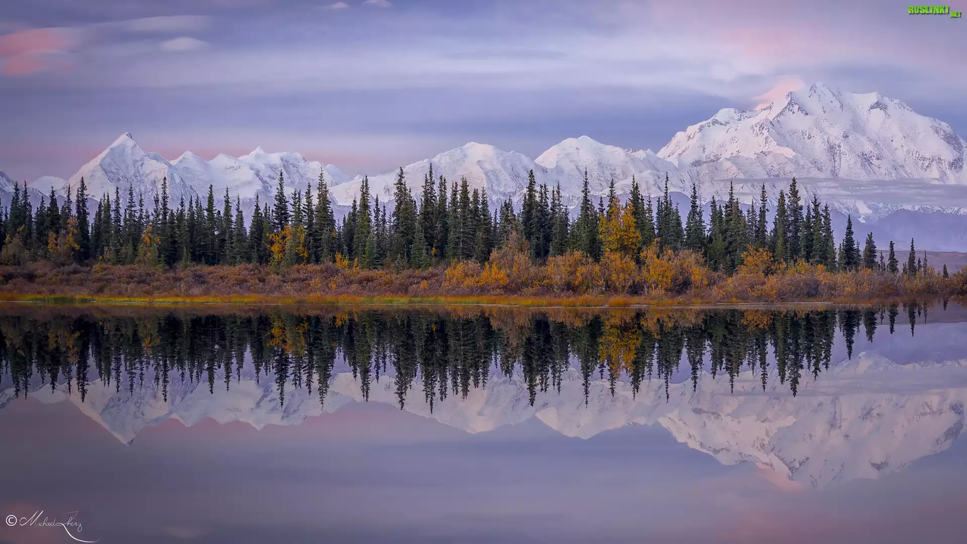 Rośliny: Park Narodowy Denali, Góry, Kordyliery, Góra Denali, McKinley, Drzewa, Las, Rzeka, Alaska, Stany Zjednoczone