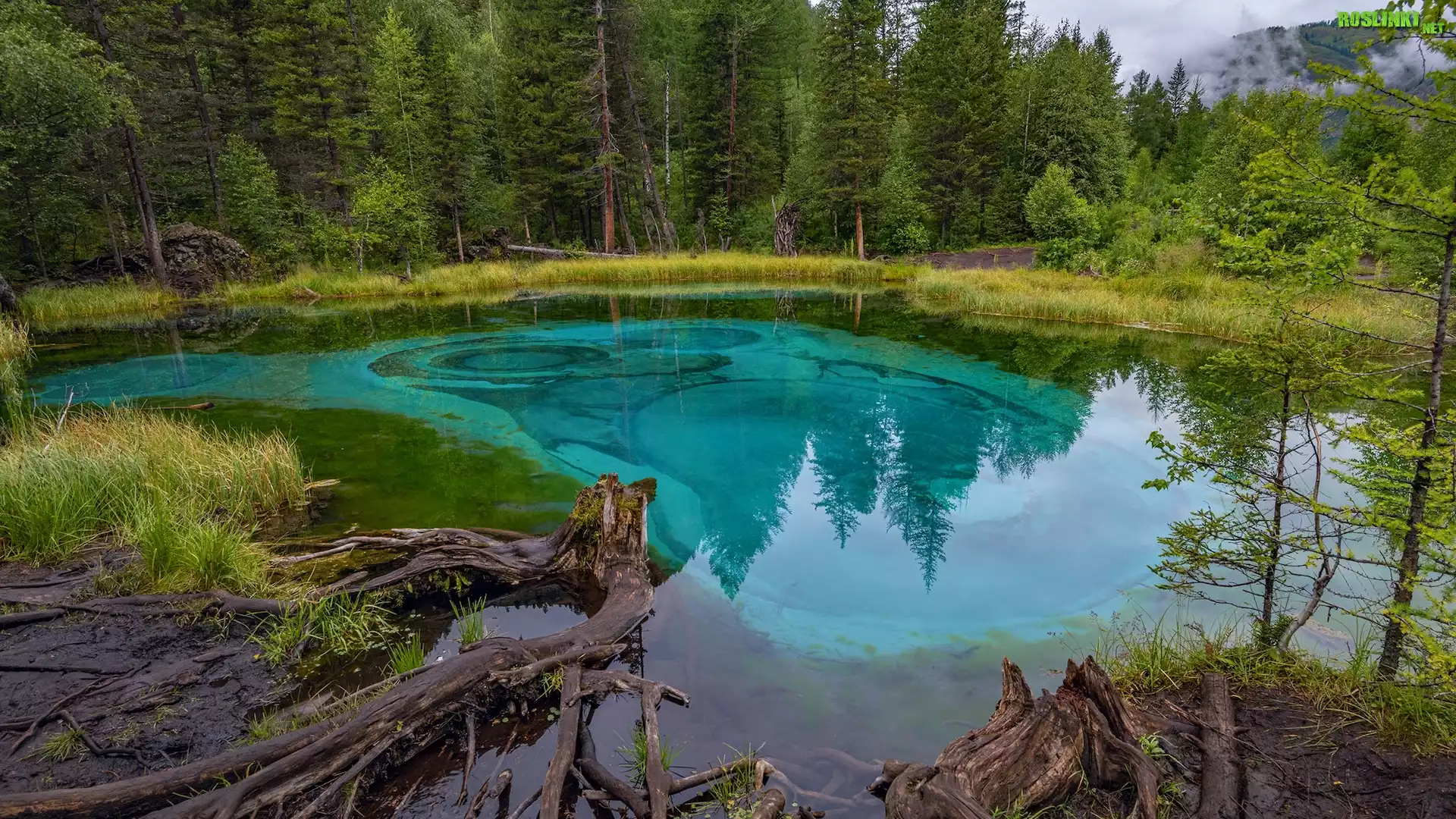 Rośliny: Rosja, Republika Ałtaju, Jezioro Geysernoe, Las, Drzewa, Trawa, Korzenie