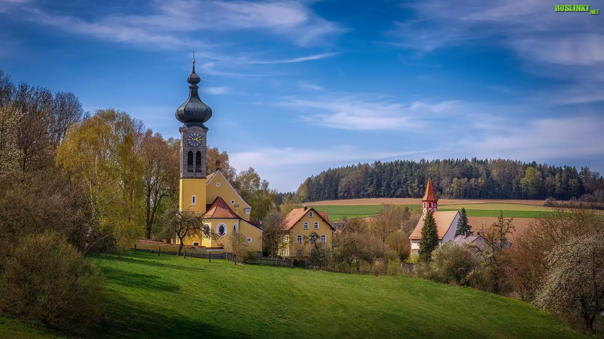 Rośliny: Kościół, Św Ulricha, Domy, Lasy, Drzewa, Pola, Wilchenreuth, Bawaria, Niemcy