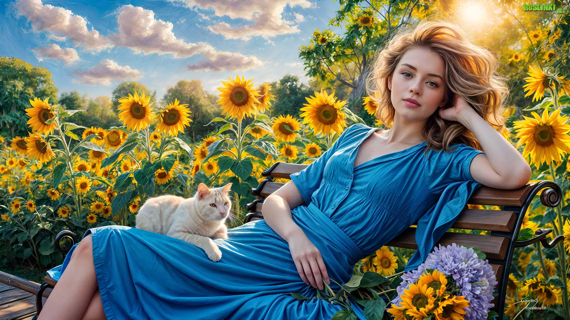 Rośliny: Kobieta, Kot, Ławka, Słoneczniki, Grafika