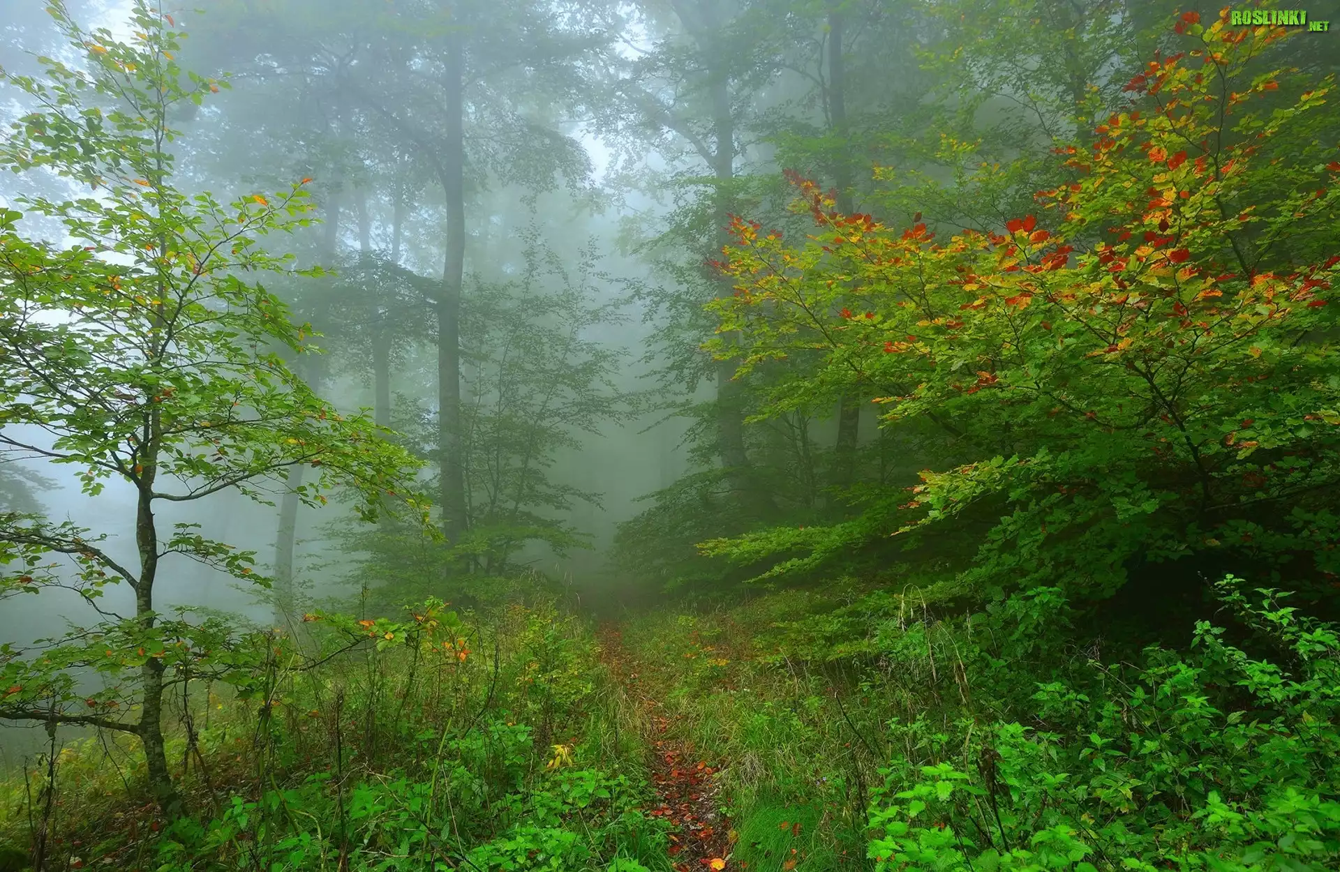 Rośliny: Hiszpania, Kraj Basków, Las, Zielony, Mgła, Ścieżka, Drzewa