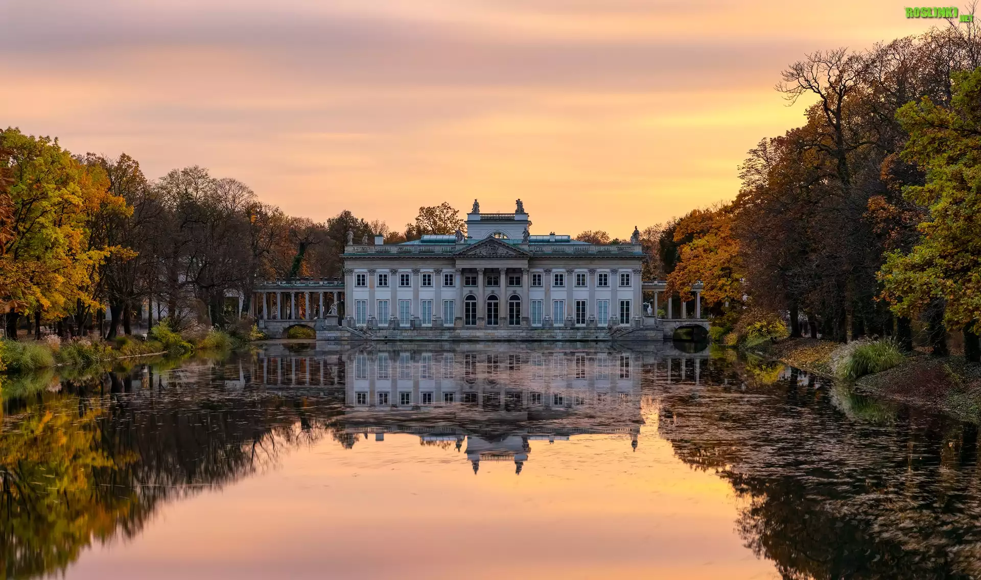 Rośliny: Jesień, Pałac na Wyspie, Staw, Drzewa, Zachód słońca, Łazienki Królewskie, Warszawa, Polska