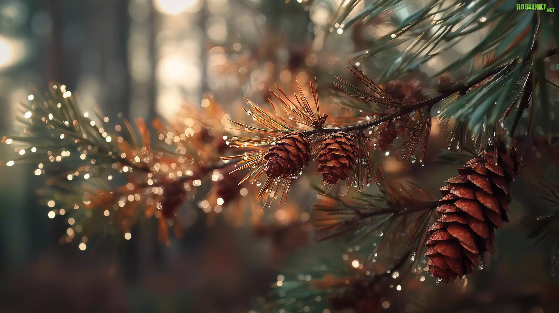 Rośliny: Gałązki, Sosna, Szyszki, Krople