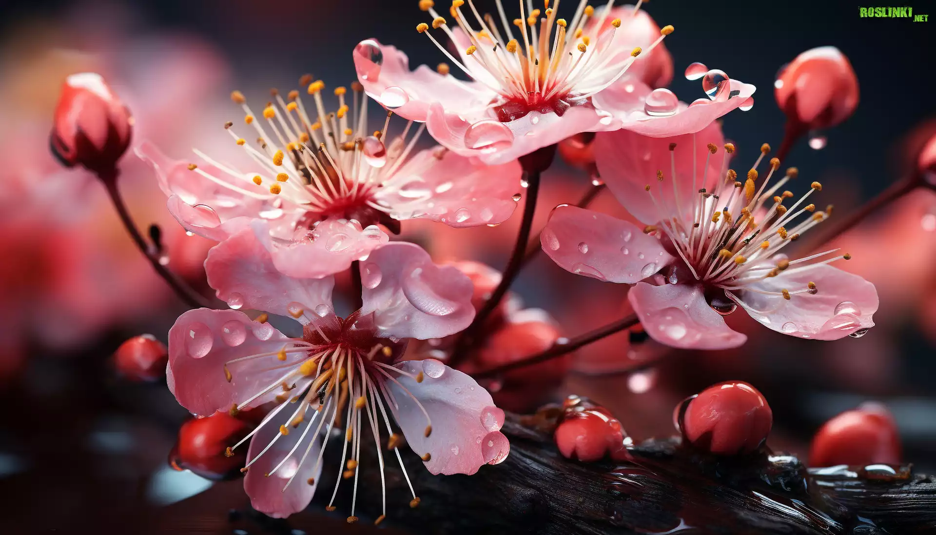 Rośliny: Drzewo owocowe, Rozwinięte, Różowe, Kwiaty, Pąki, Gałązki, Krople