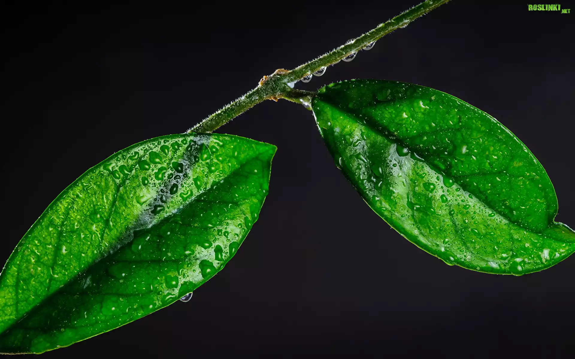 Dwa, Zielone, Liście, Krople, Ciemne Tło