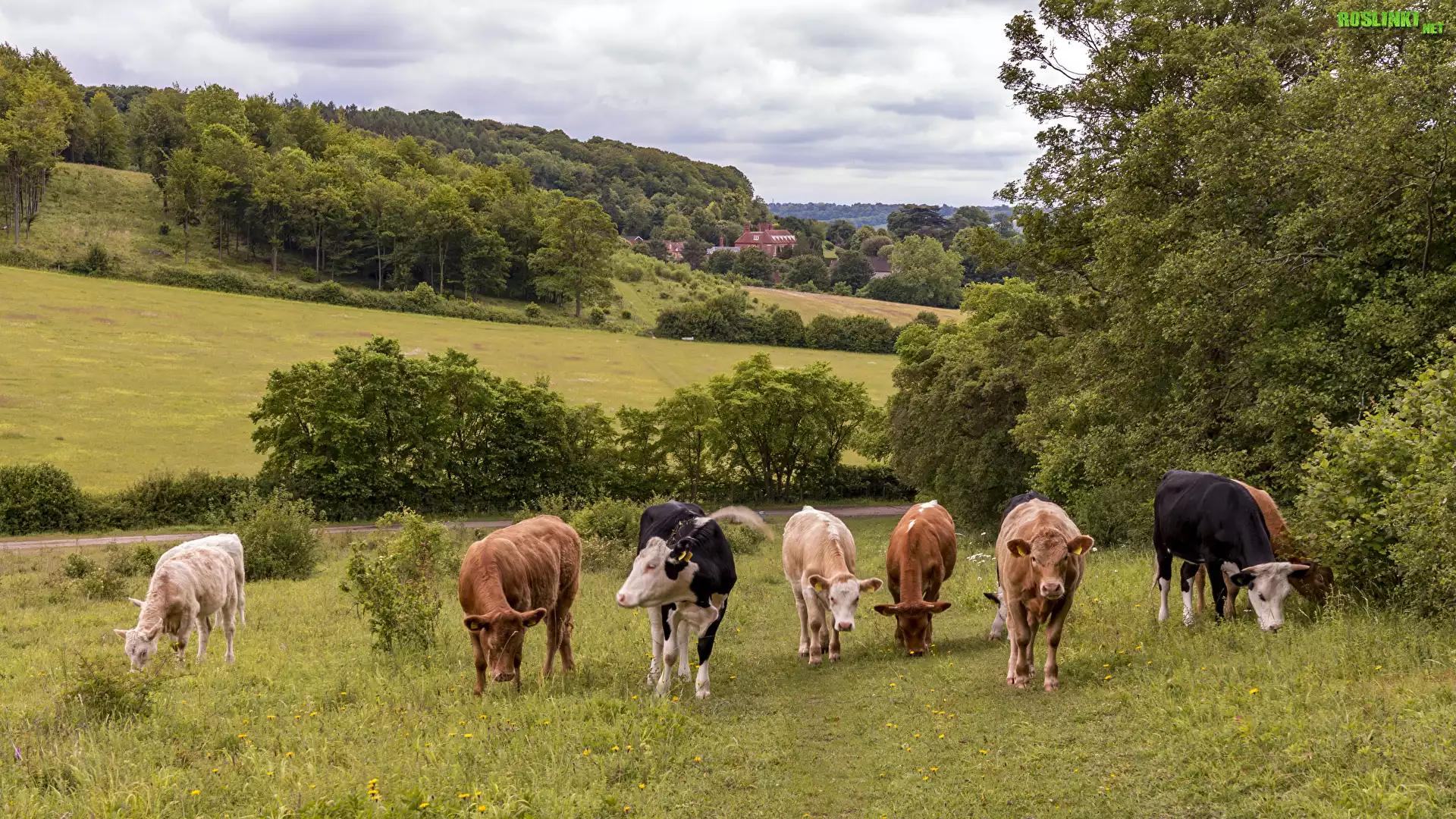 Rośliny: Krowy, Łąka, Trawa, Drzewa, Domy