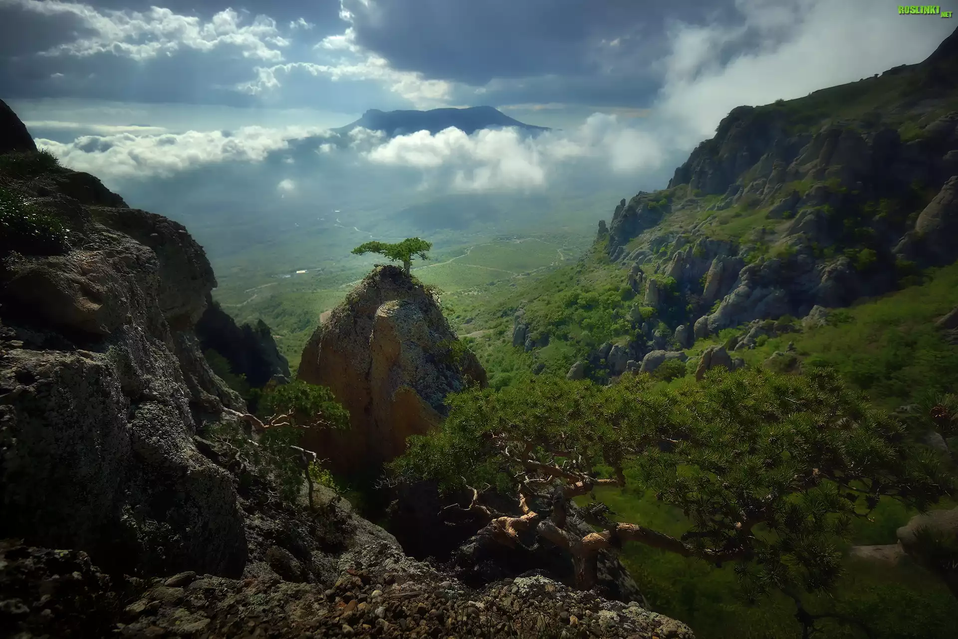 Rośliny: Góry Krymskie, Masyw Demerdżi, Skała, Drzewa, Sosny, Mgła, Chmury, Krym
