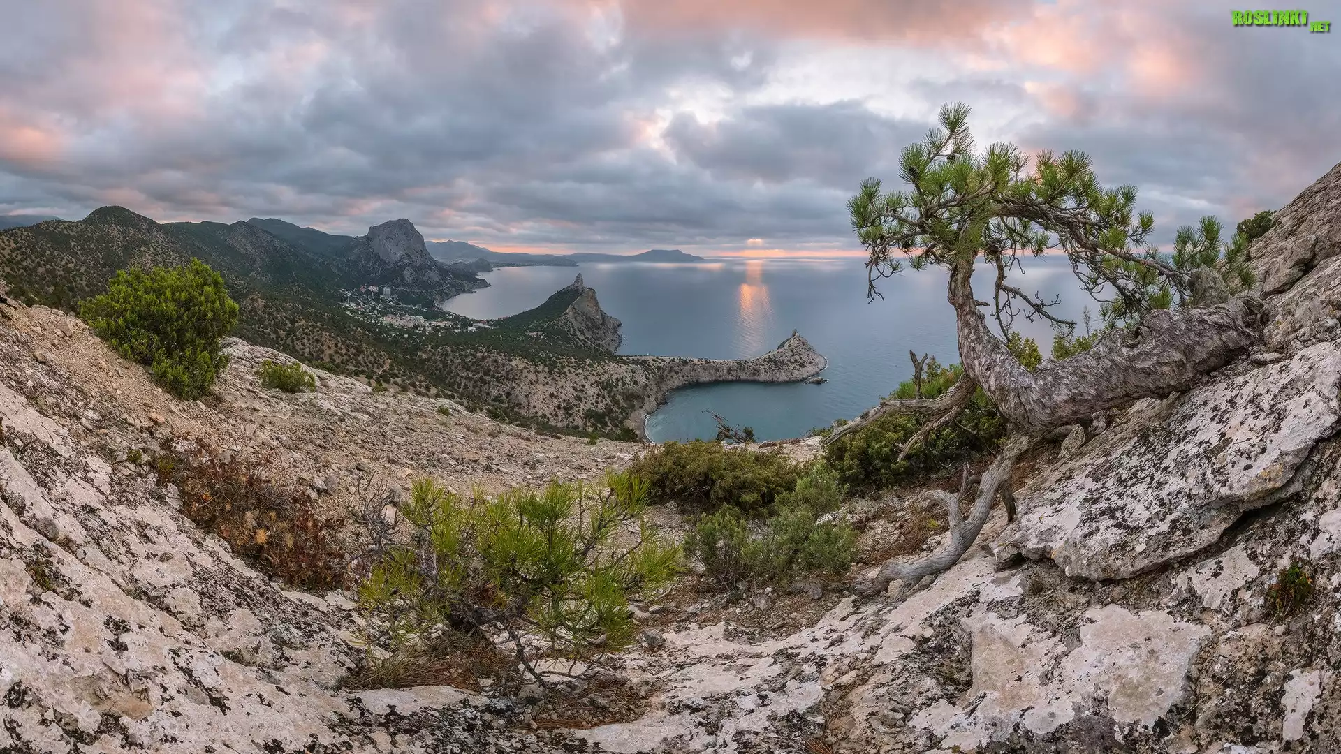 Rośliny: Wschód słońca, Morze Czarne, Wybrzeże, Skały, Drzewa, Sosny, Roślinność, Krym