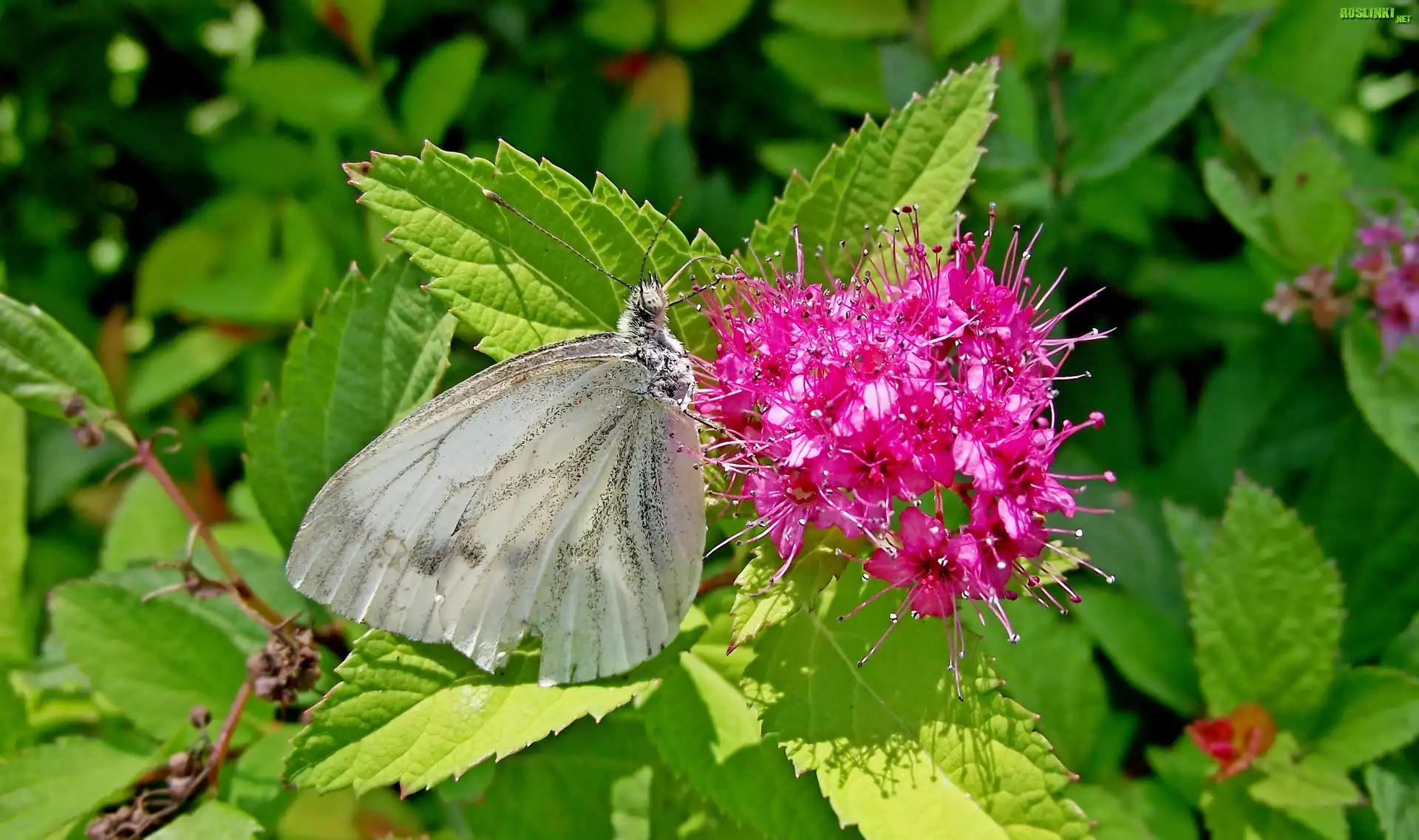 Rośliny: Krzew, Pęcherznica kalinolistna, Motyl, Bielinek