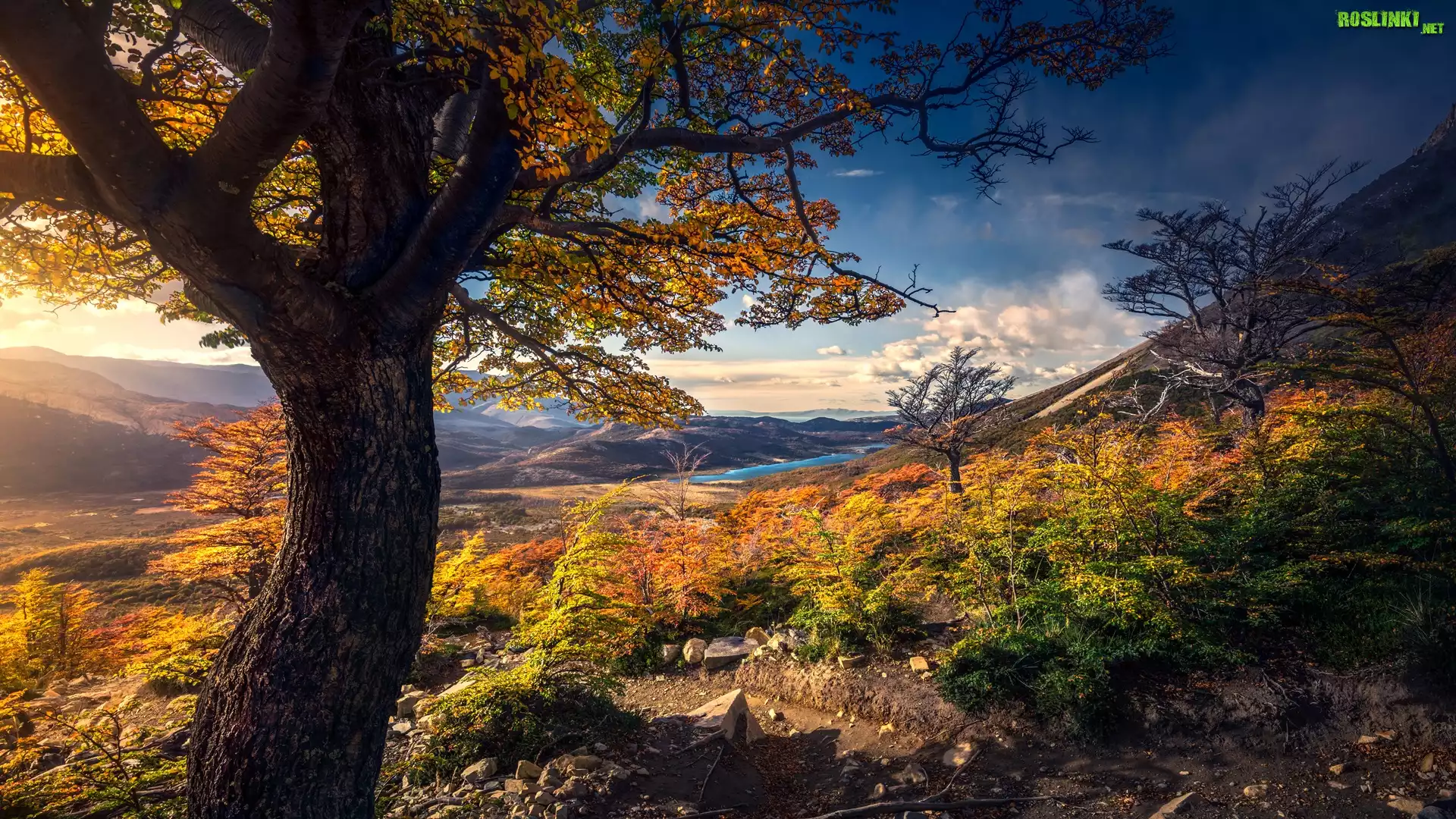 Rośliny: Góry, Rzeka, Drzewa, Krzewy, Jesień, Chmury