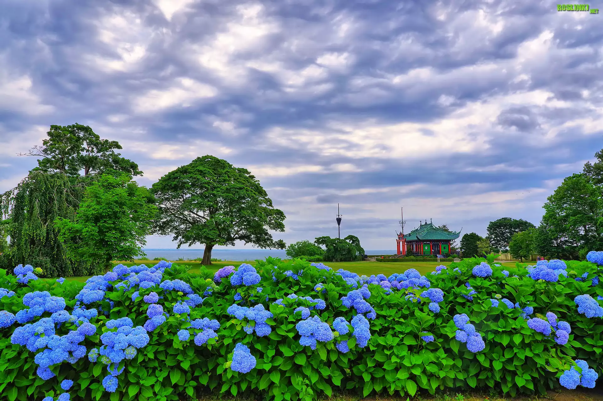 Rośliny: Krzewy, Niebieskie, Hortensje, Drzewa, Dom, Chmury