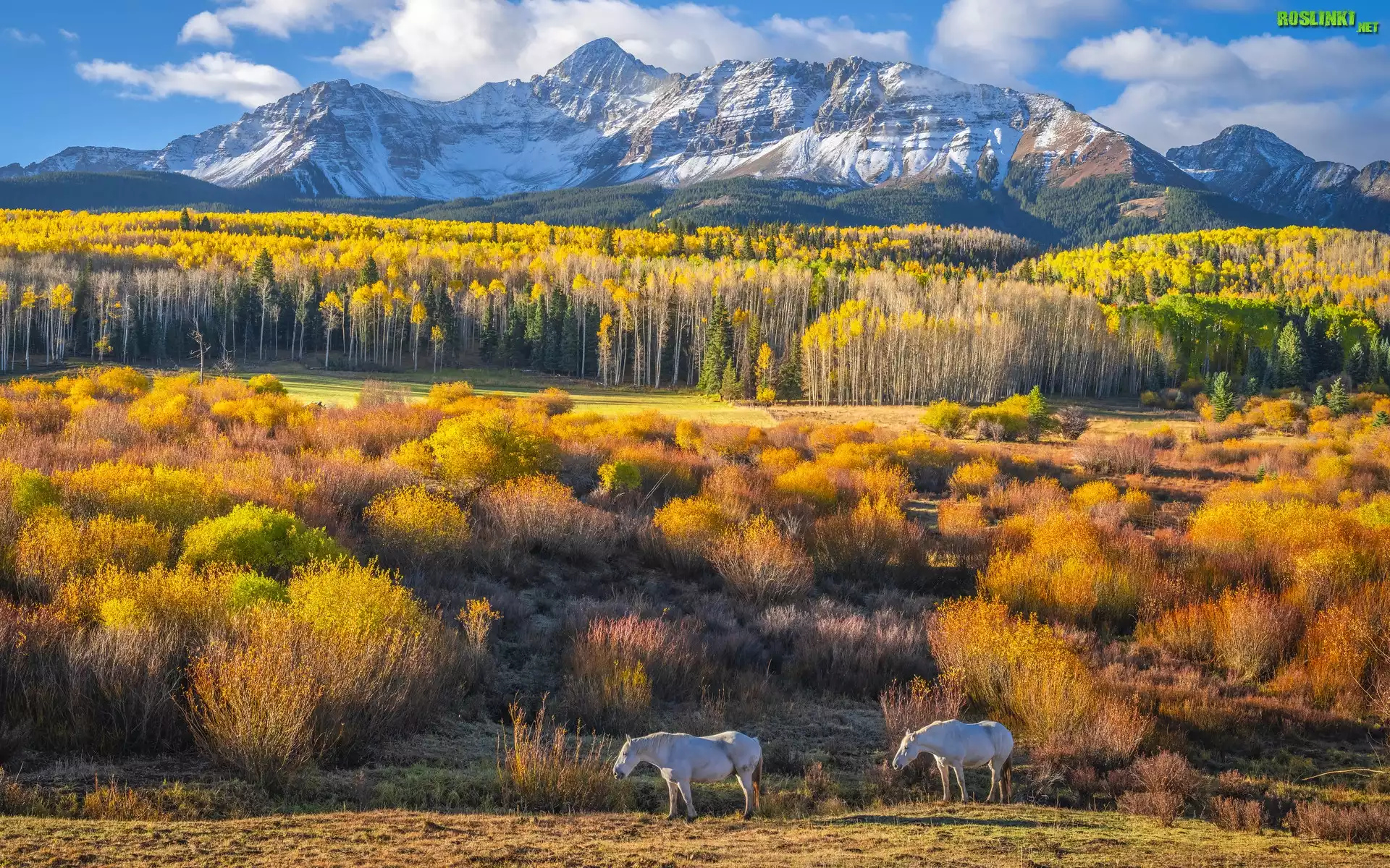 Stany Zjednoczone, Kolorado, Góra, Wilson Peak, Konie, Las, Drzewa, Krzewy Jesień, Chmury