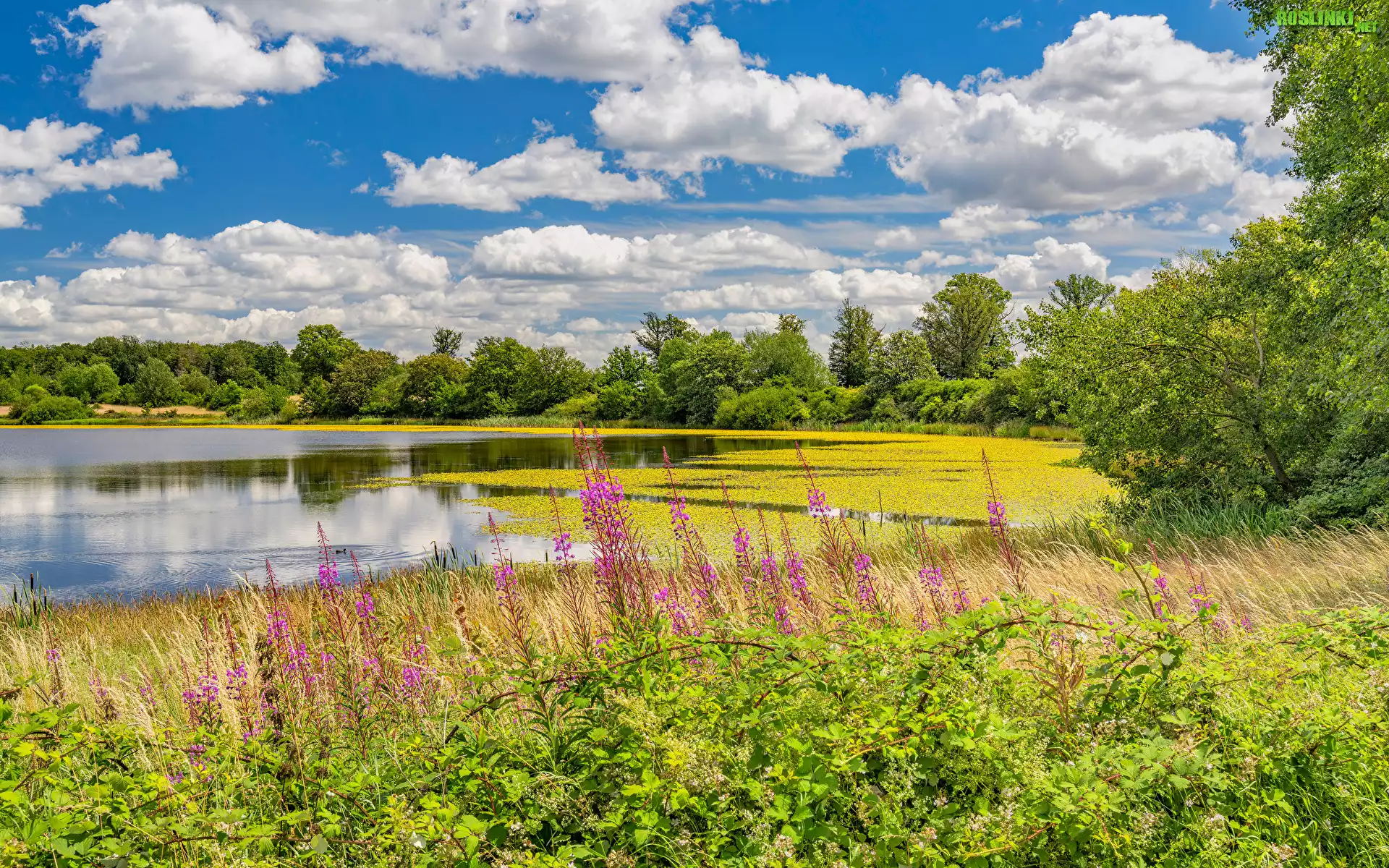 Rośliny: Niemcy, Park Narodowy Eifel, Jezioro Urft, Krzewy, Kwiaty, Drzewa, Niebo, Łąka