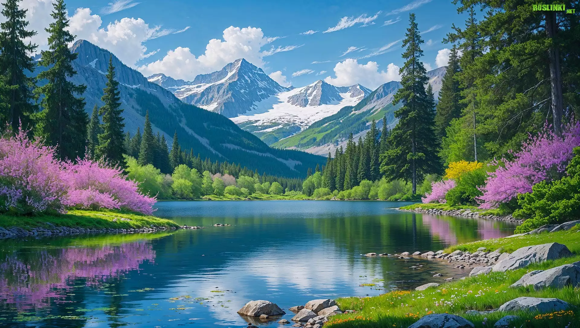 Rośliny: Wiosna, Drzewa, Kwitnące, Krzewy, Jezioro, Góry, Grafika