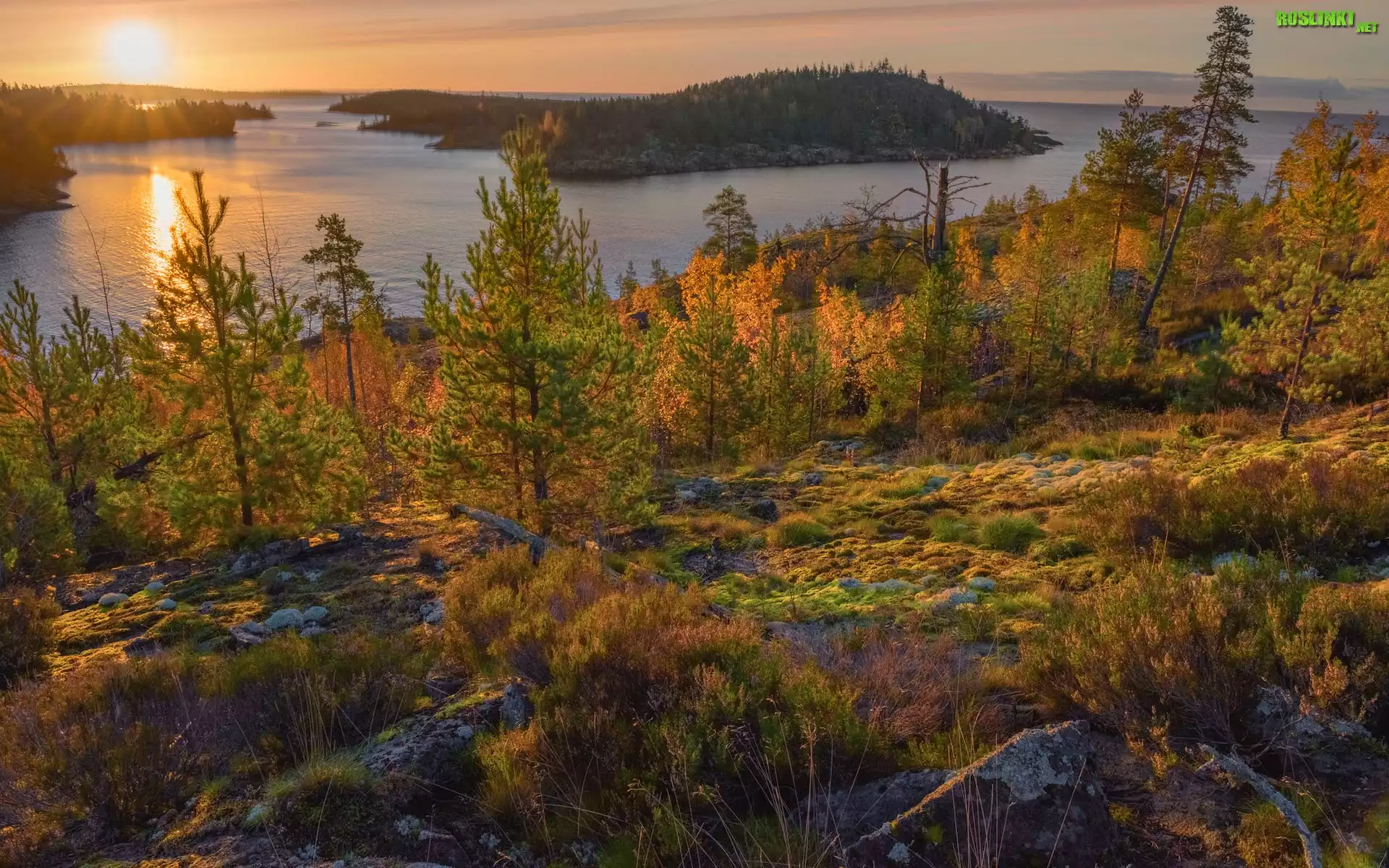 Rośliny: Rosja, Jezioro, Ładoga, Jesień, Drzewa, Promienie słońca, Krzewy
