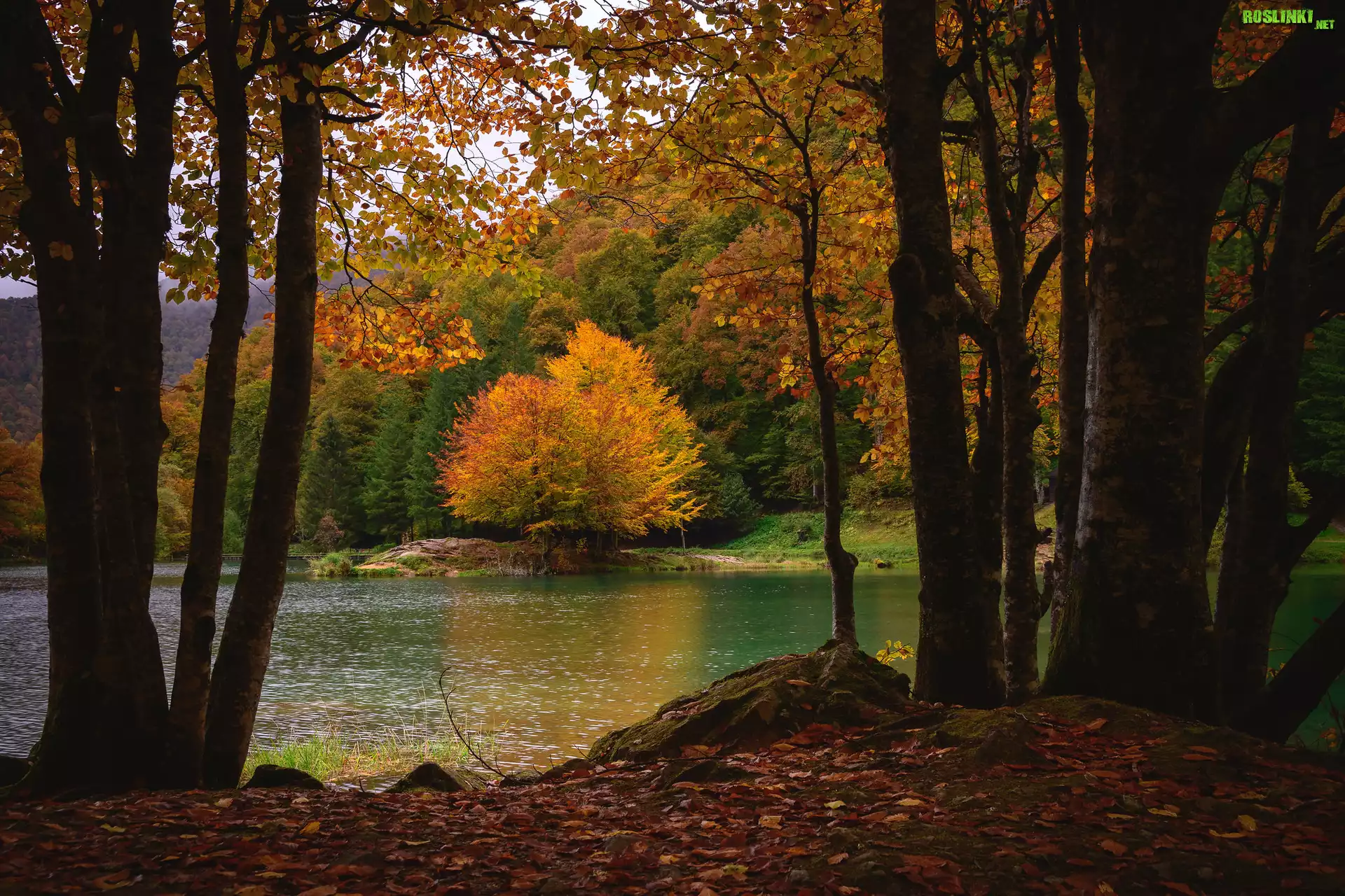 Rośliny: Jesień, Jezioro, Drzewa, Krzewy, Pożółkłe, Liście
