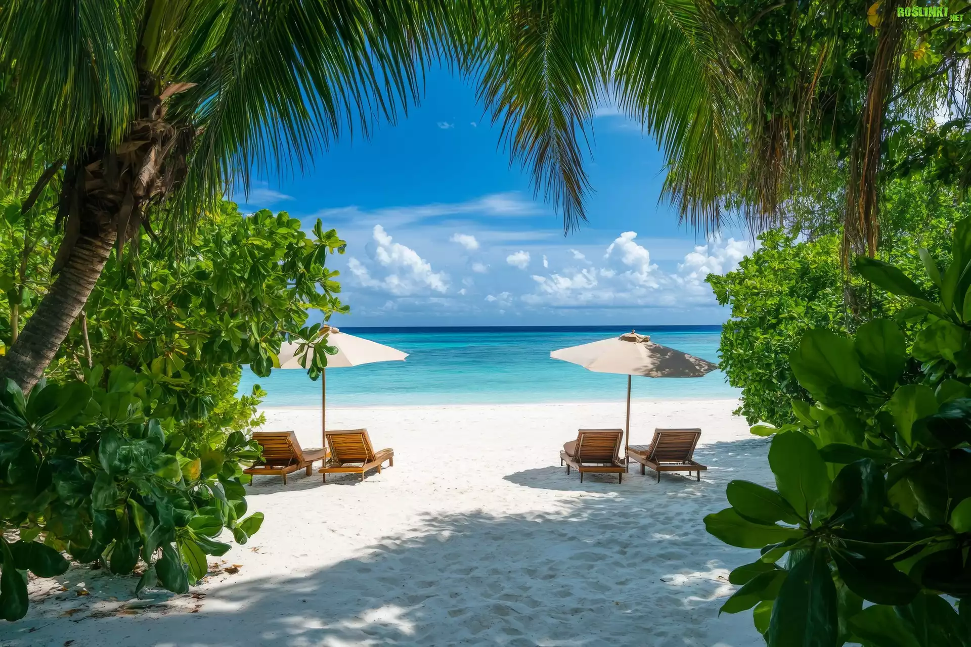 Rośliny: Morze, Plaża, Palmy, Krzewy, Rośliny, Leżaki, Parasole