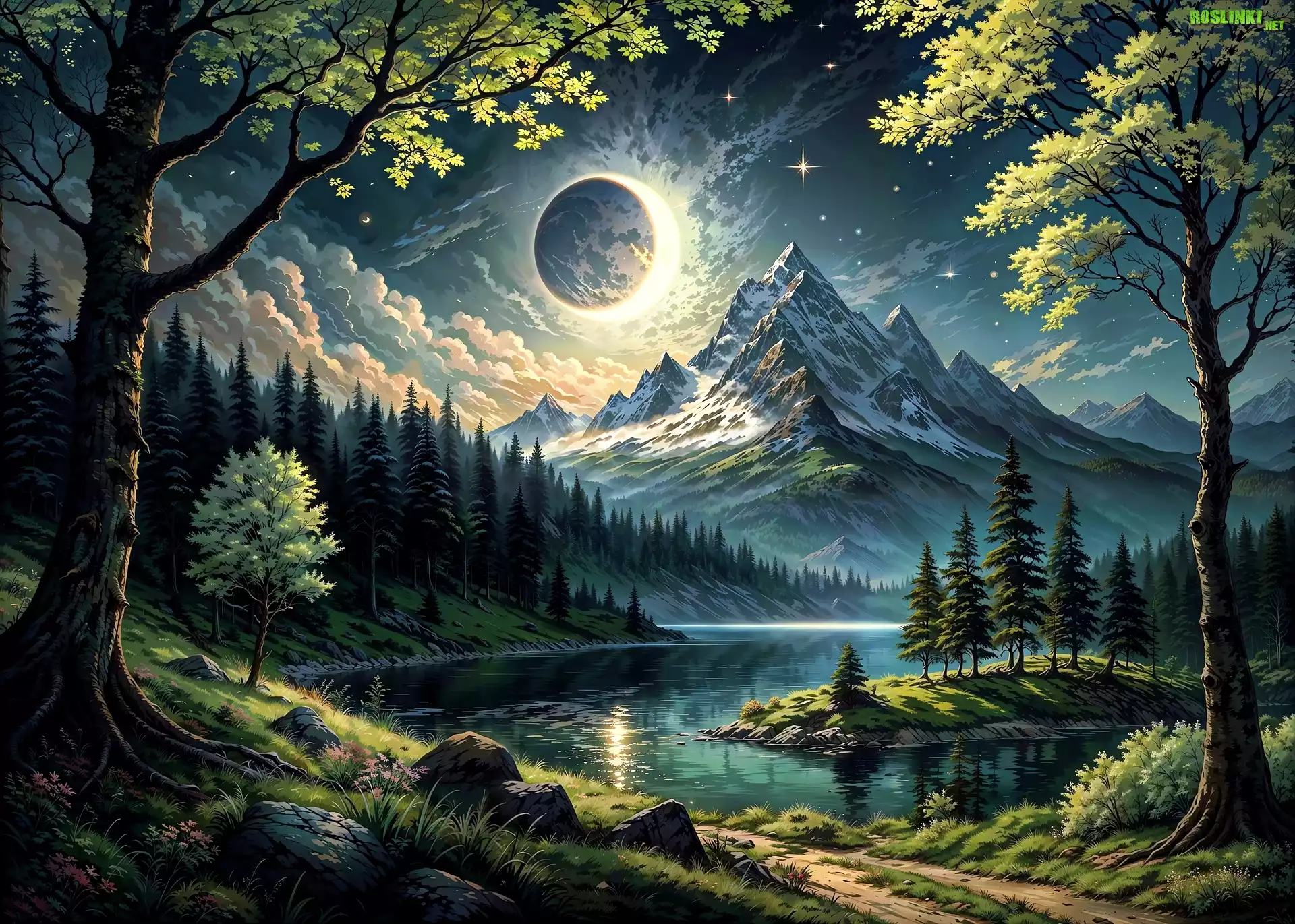 Rośliny: Rzeka, Drzewa, Góry, Księżyc, Grafika AI
