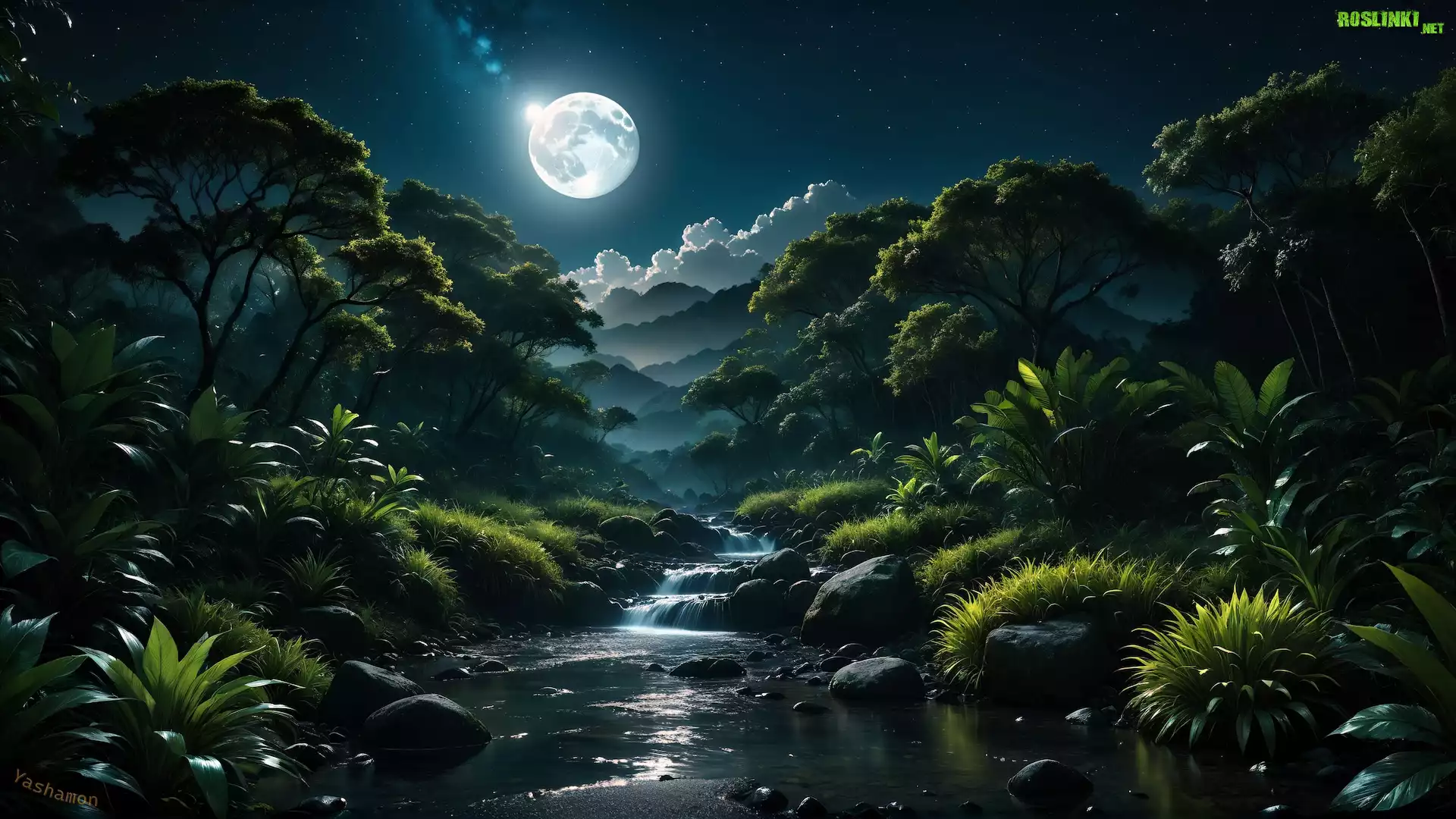 Rośliny: Grafika, Rzeka, Noc, Księżyc, Roślinność, Drzewa