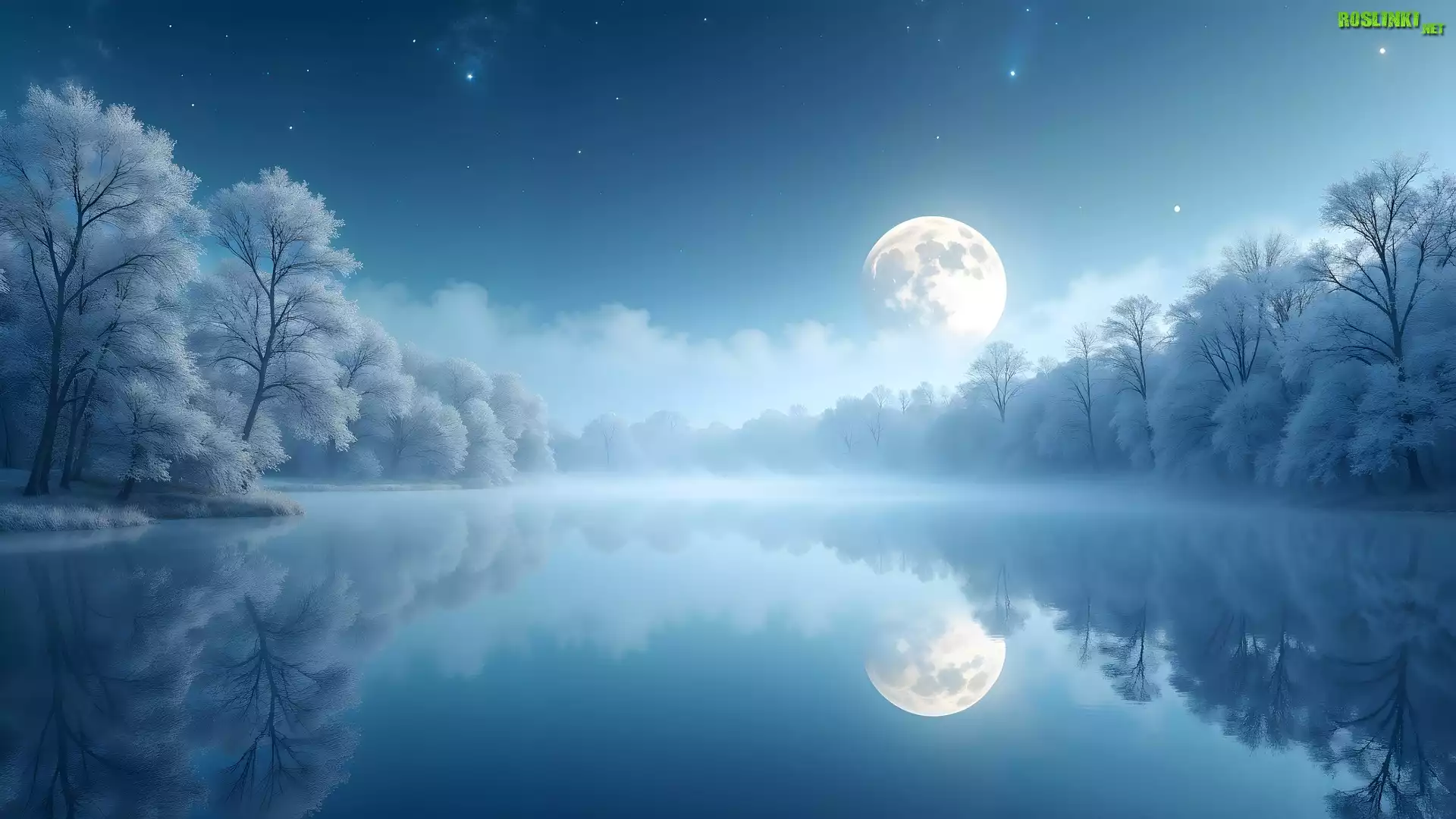 Rośliny: Jezioro, Ośnieżone, Drzewa, Księżyc