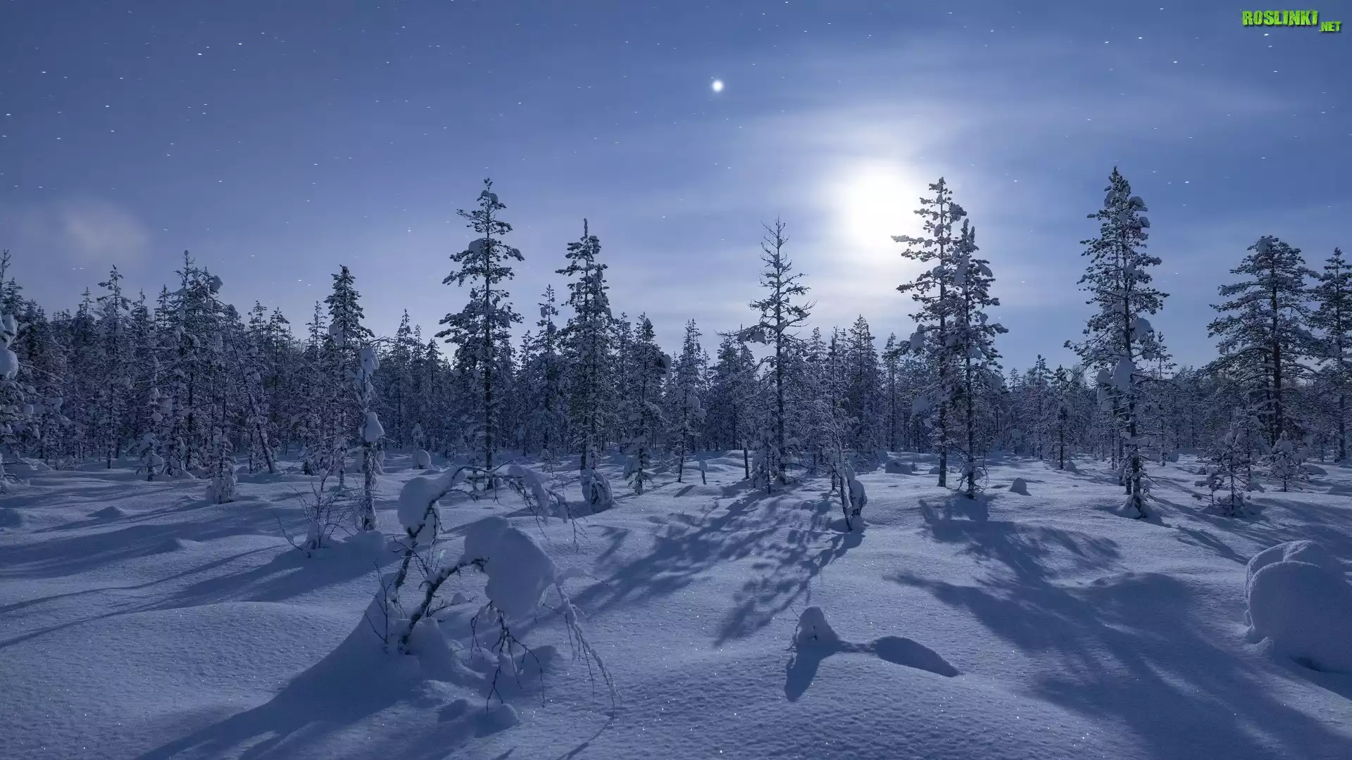 Rośliny: Zima, Noc, Las, Księżyc, Gwiazdy, Śnieg, Drzewa