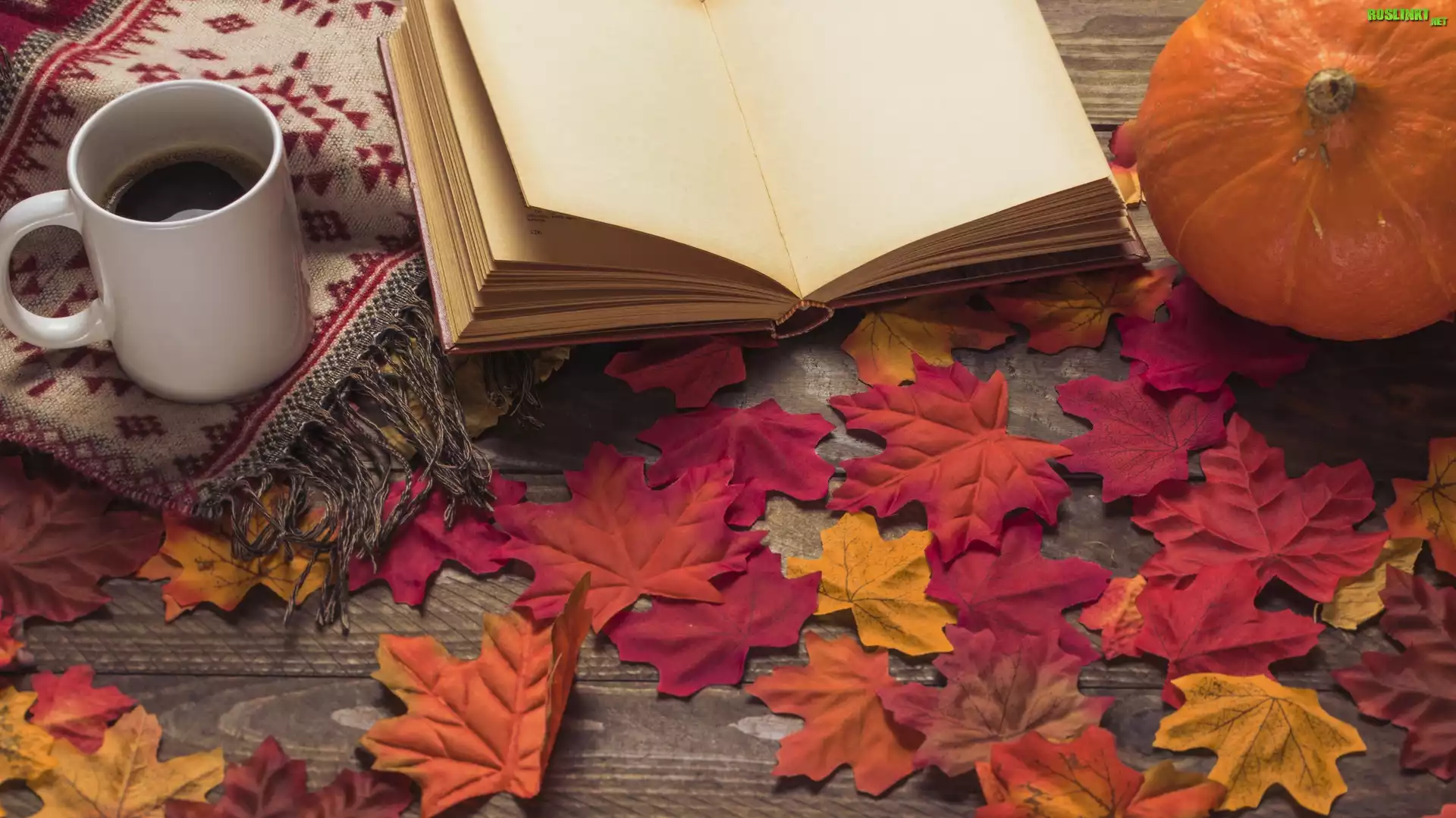 Rośliny: Kawa, Kubek, Szal, Liście, Książka, Dynia, Kompozycja