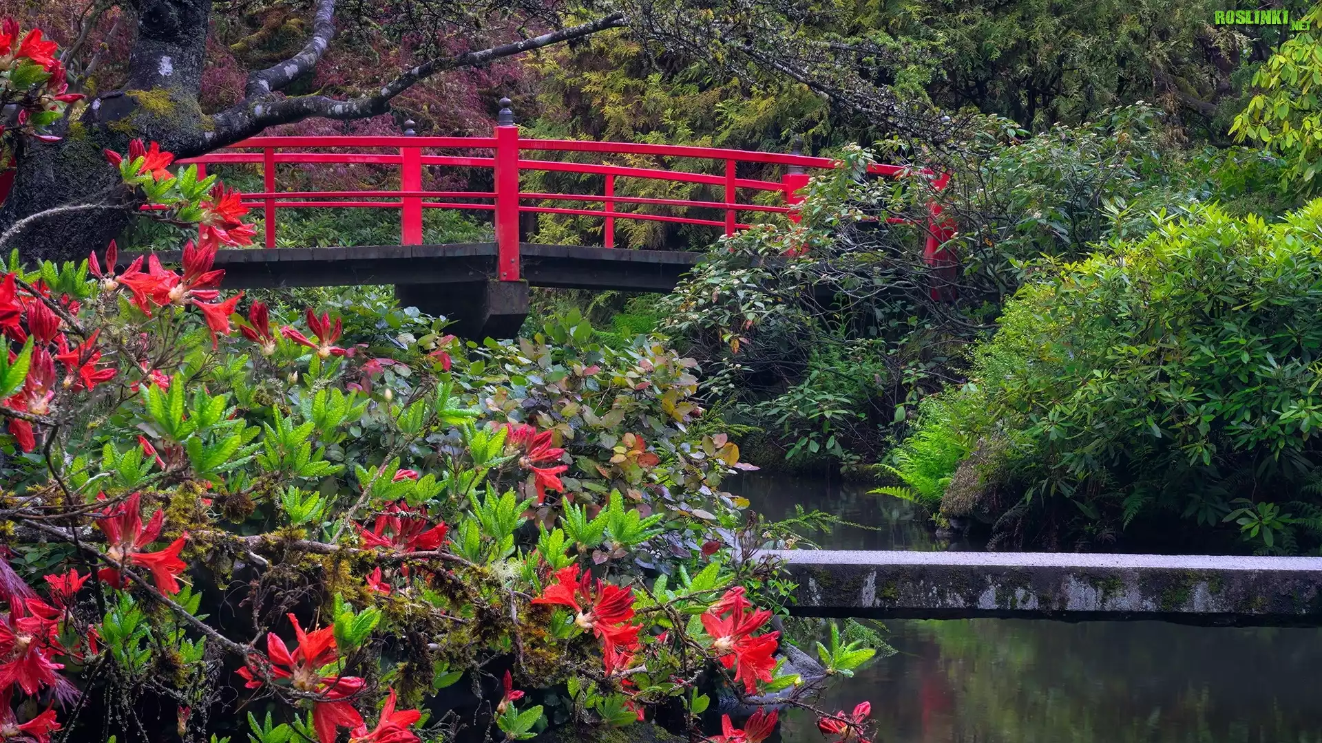 Ogród, Czerwony, Mostek, Krzew, Różanecznik, Kubota Garden, Seattle, Stan Waszyngton, Stany Zjednoczone |