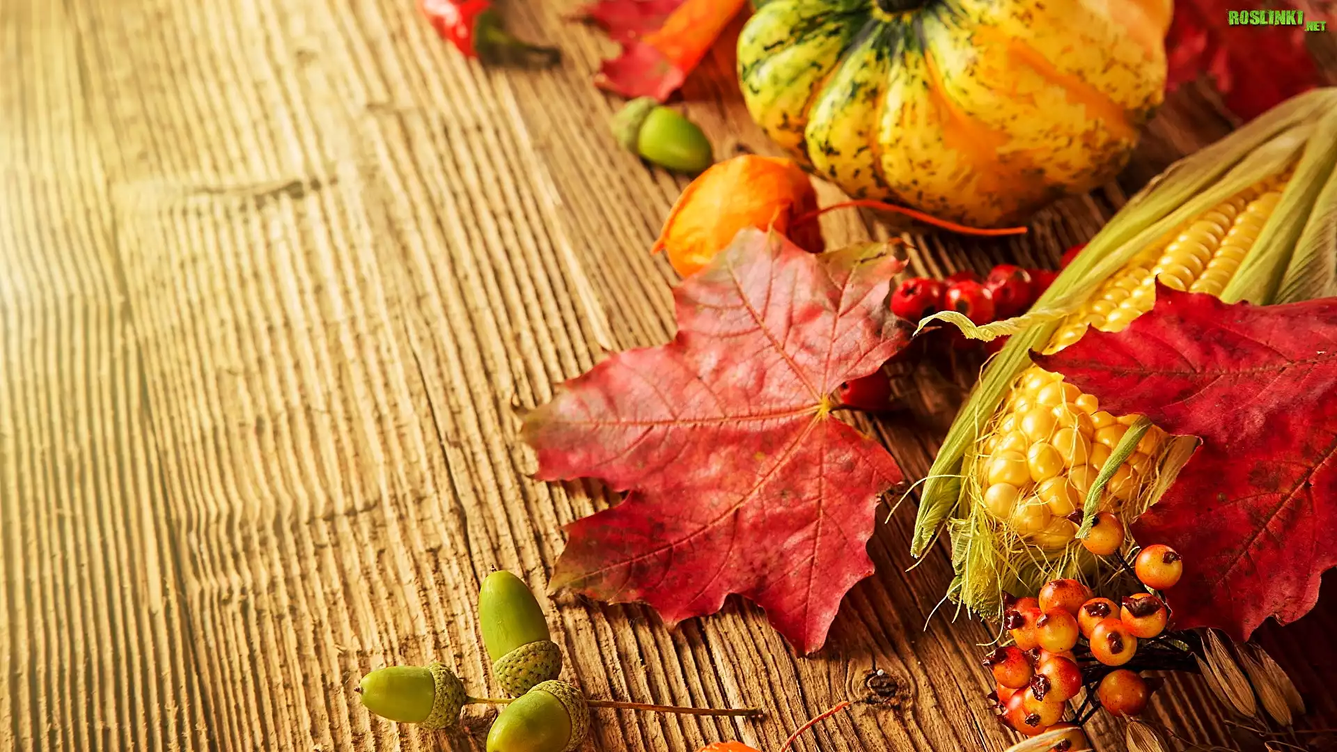 Rośliny: Dynia, Kukurydza, Liście, Jarzębina, Żołędzie, Drewno, Kompozycja
