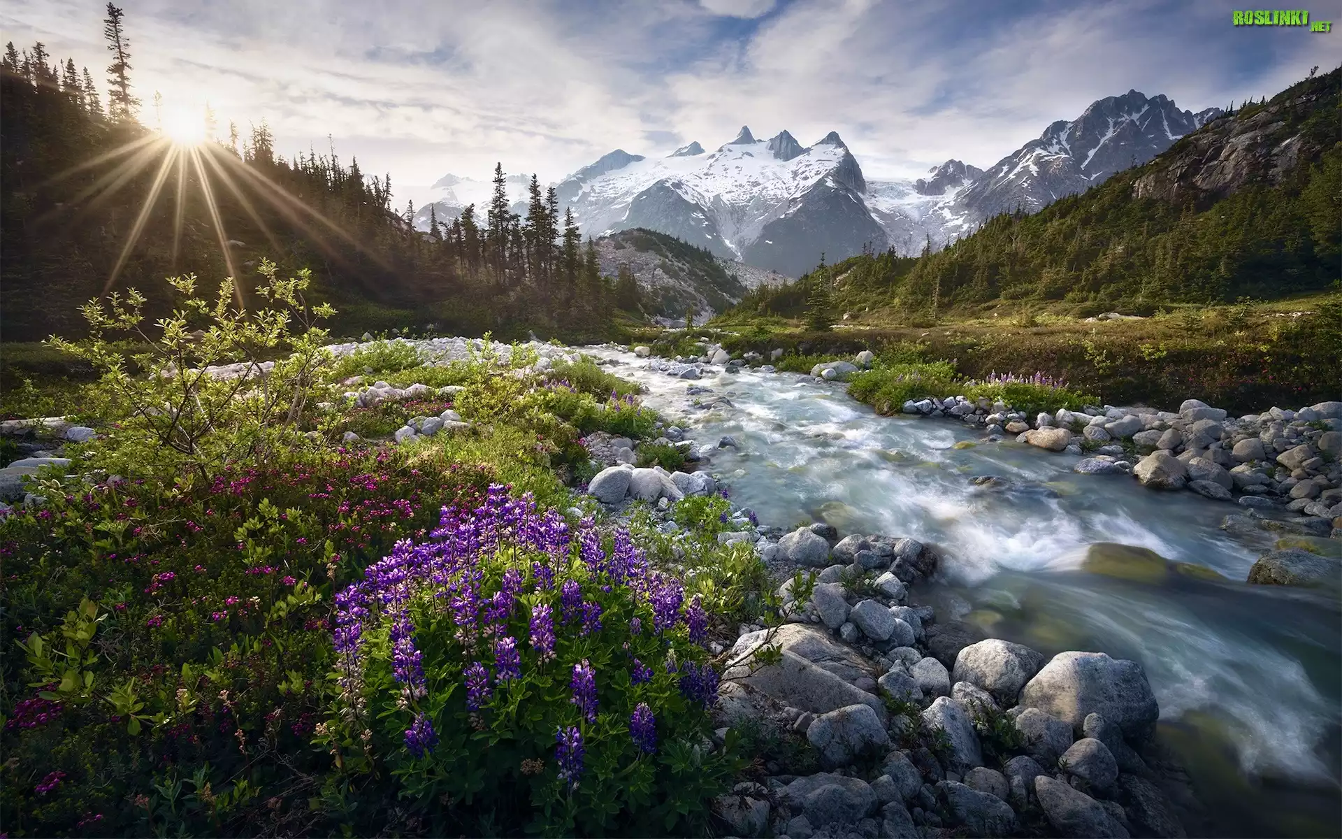 Kanada, Kolumbia Brytyjska, Region Chilcotin, Góry, Rzeka, Promienie słońca, Kwiaty, Kamienie, Rośliny |