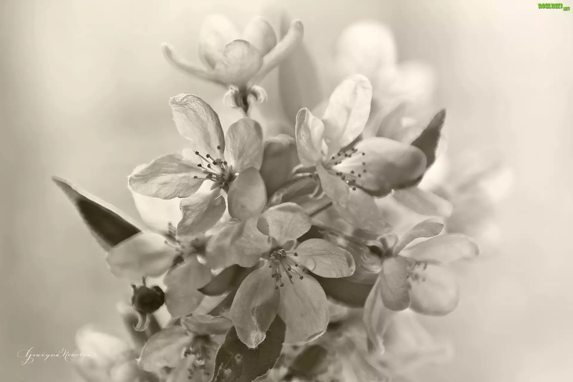 Kwiaty, Drzewo, Owocowe, Czarno - Białe