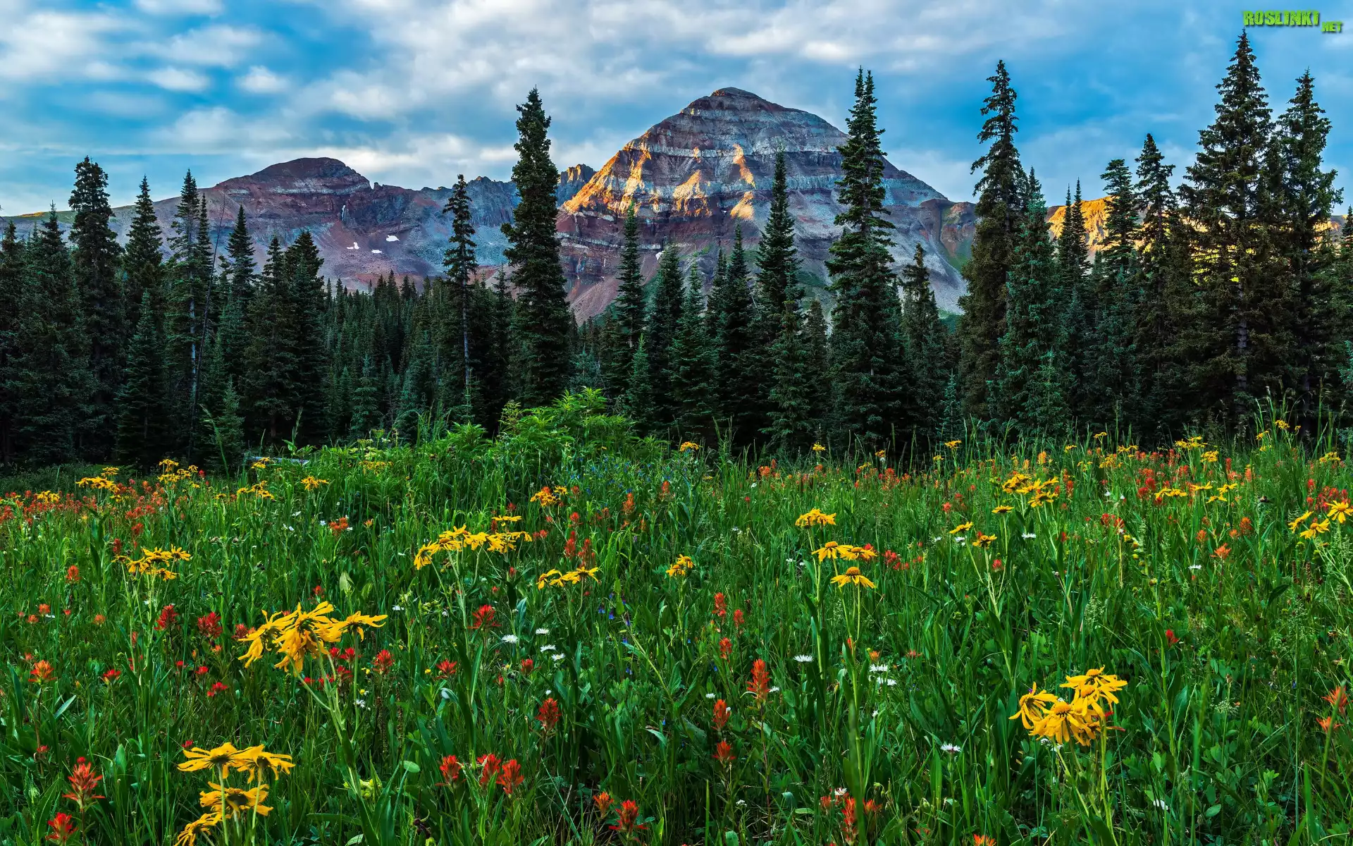 Stany Zjednoczone, Kolorado, San Juan Mountains, Hesperus Peak, Łąka, Kwiaty, Drzewa, Góry, Chmury
