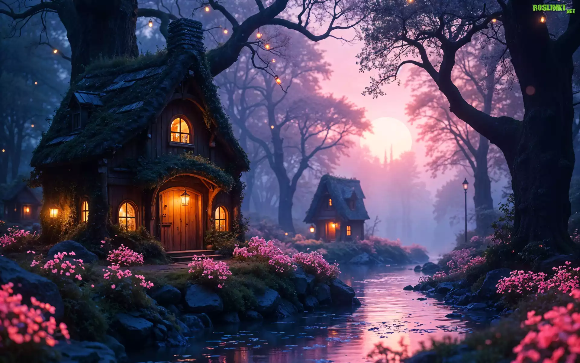 Rośliny: Domy, Rzeka, Drzewa, Kwiaty, Zmrok, Grafika AI