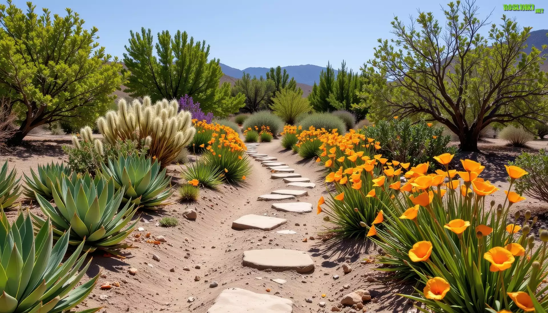 Rośliny: Ogród, Ścieżka, Drzewa, Kwiaty, Agawa, Krzewy, Rośliny