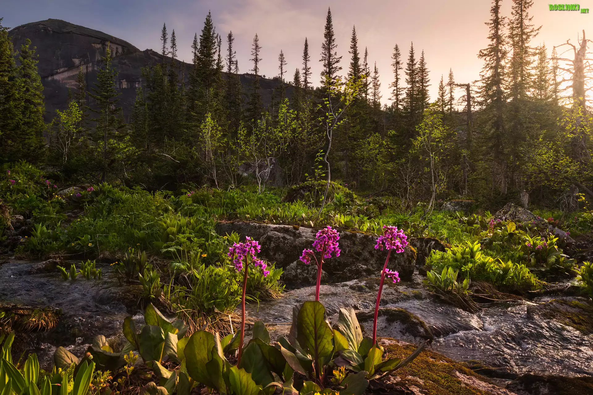 Rośliny: Kwiaty, Kamienie, Strumień, Góry, Drzewa, Rośliny