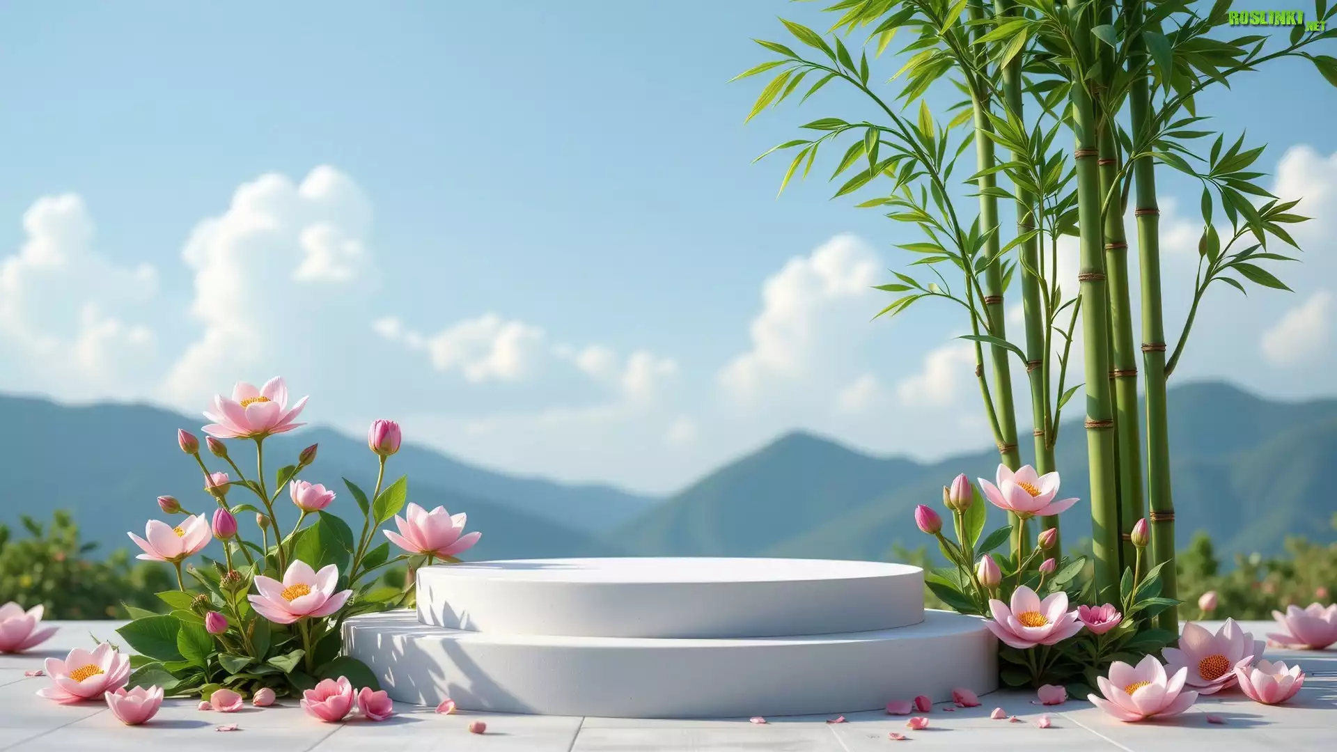 Rośliny: Podium, Drzewo, Bambus, Kwiaty, Lotosy, Góry