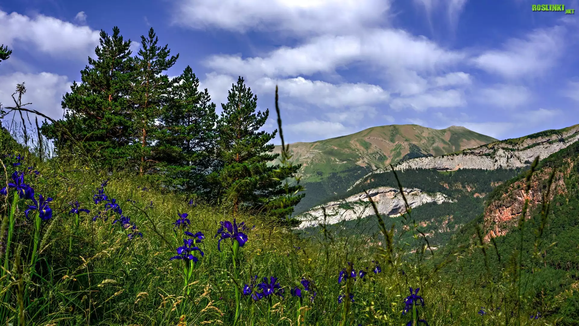 Rośliny: Góry, Skały, Drzewa, Kwiaty, Niebieskie, Irysy