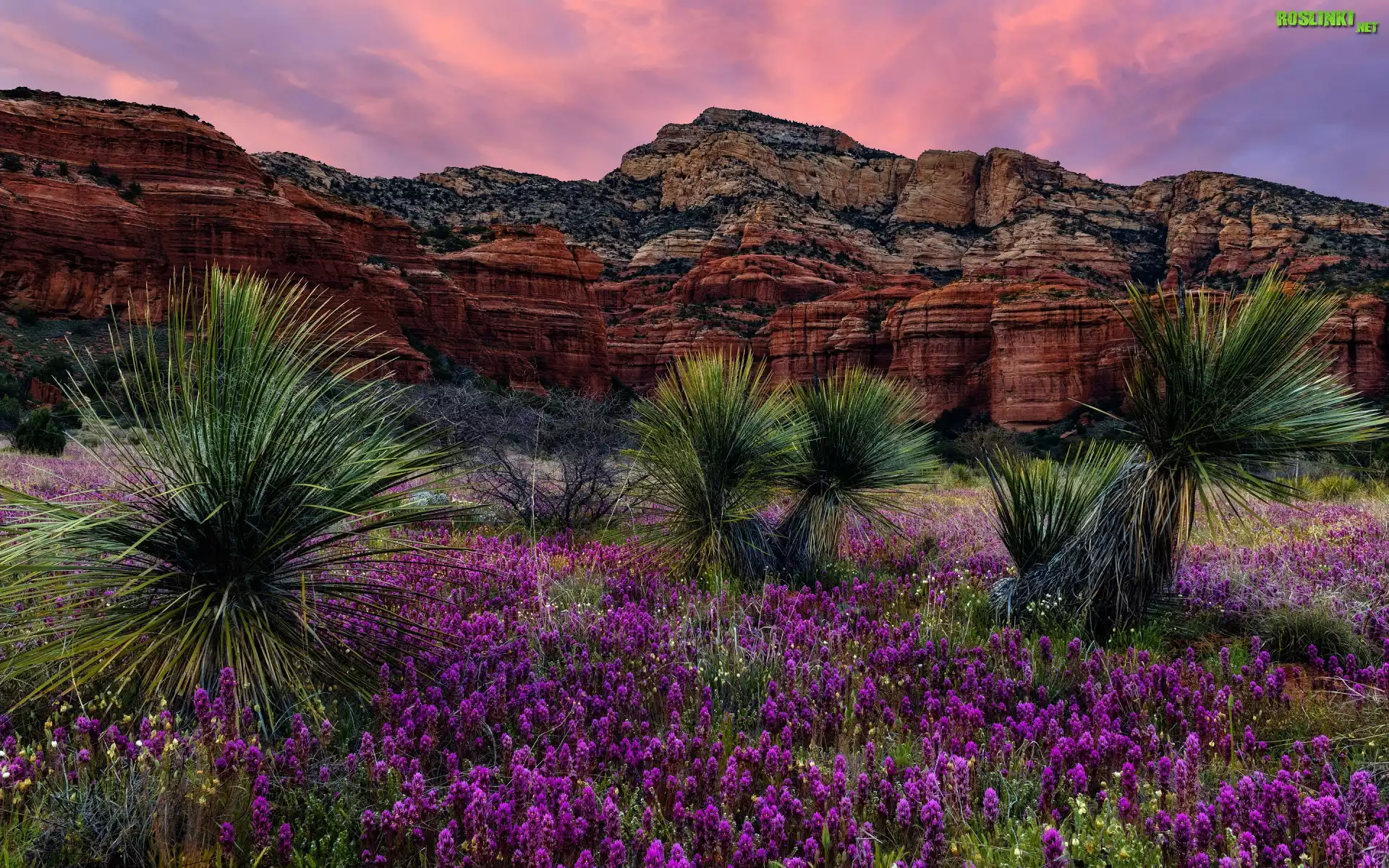 Stany Zjednoczone, Arizona, Sedona, Bear Mountain, Niebo, Skały, Juki, Kwiaty, Zachód słońca, Góry |